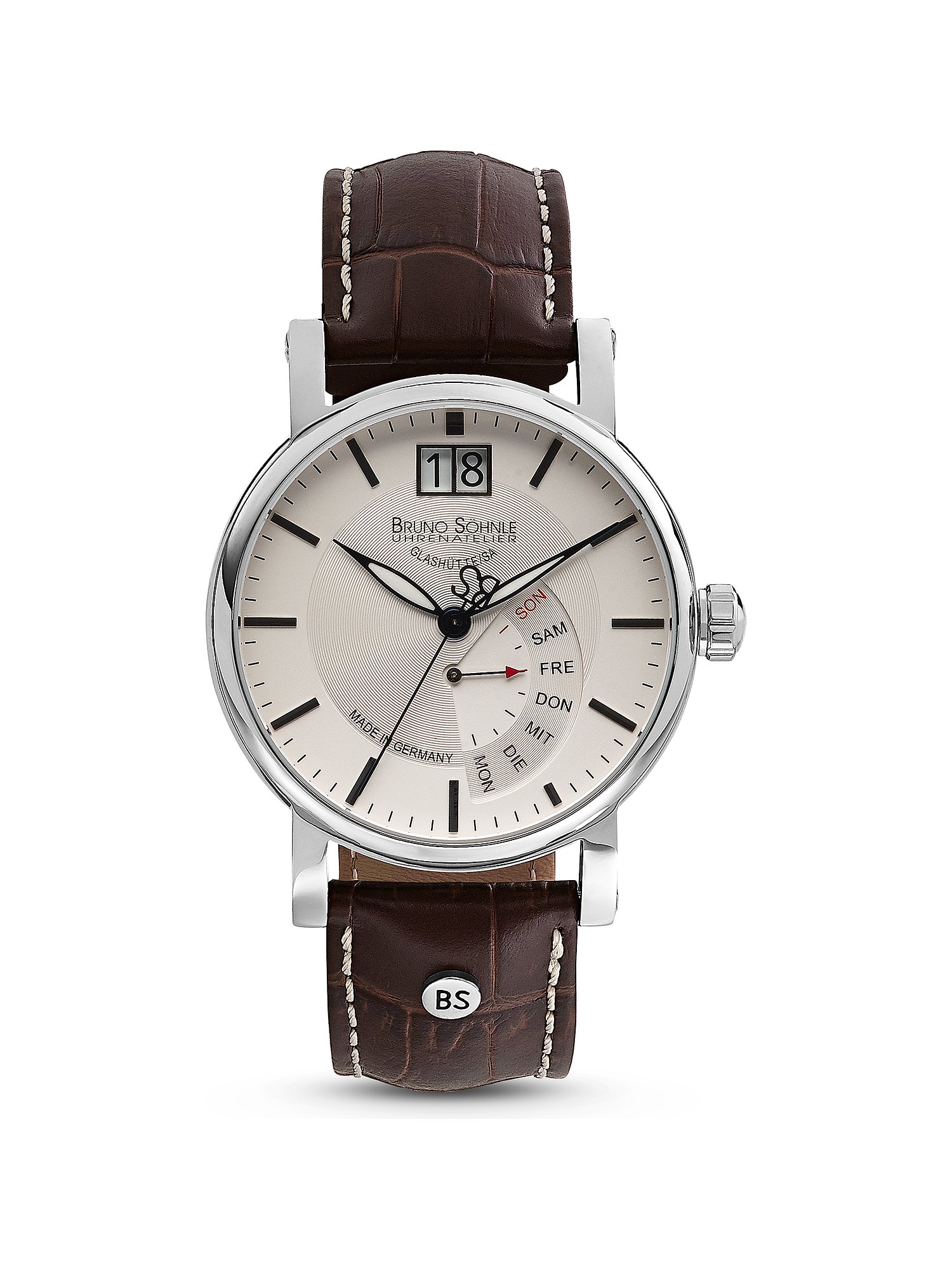 Bruno Söhnle ist weltbekannt für seine hochwertigen und präzisen Uhren, die Sie begeistern werden. Die deutsche Manufaktur aus Glashütte kombiniert moderne Technologie mit klassischer Uhrmacherkunst, um Ihnen ein unvergleichliches Trageerlebnis zu bieten. Ein echter Eyecatcher, der Ihre Blicke fesseln wird, ist die Pesaro I. Diese luxuriöse Herrenuhr strahlt mit ihrem eleganten Design in bester Qualität eine unwiderstehliche Anziehungskraft aus und fügt sich harmonisch in jedes Ihrer Outfits ein. Das braune Lederarmband schmiegt sich angenehm um Ihr Handgelenk und perfektioniert den zeitlosen Look der Uhr. Mit einem Gehäusedurchmesser von 43 mm sieht die Pesaro I sowohl an schmaleren als auch an breiteren Handgelenken einfach gut aus. Das beigefarbene und cremefarbene Zifferblatt mit seinen Markierungen fügt sich gekonnt in das gelungene Gesamtbild ein. Das Ablesen der Zeit ist selbst bei ungenügenden Lichtverhältnissen ein Kinderspiel - der Leuchtzeiger sei Dank! Mit diesem Zeitmesser behalten Sie nicht nur die Zeit zuverlässig im Blick, sondern auch das Datum und den Wochentag. Ein ebenso hochwertiges wie robustes Saphirglas schützt das Zifferblatt vor Kratzern, Stößen und Schlägen. Im Inneren sorgt ein hochwertiges Ronda-Quarzwerk für präzise Zeitmessung. Durch das Sichtfenster im Gehäuseboden erhalten Sie spannende Einblicke in die Arbeit des Uhrwerks. Mit einer Wasserdichtigkeit bis 10 bar ist die Uhr der ideale Begleiter für Alltag und Abenteuer: Sogar Schwimmen ist unbesorgt möglich. Die Butterfly-Faltschließe verspricht nicht nur sicheren Halt, sondern auch gute Verstellbarkeit. Für mehr Variabilität ist das Armband leicht austauschbar, sodass Sie den Look der Uhr noch besser an verschiedene Outfits anpassen können.