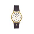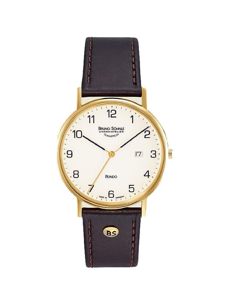 Diese elegante Herrenuhr der Linie Rondo von Bruno Söhnle besticht durch ihr edel anmutendes Design. Das Gehäuse ist aus Edelstahl und misst 38 mm im Durchmesser und 5,9 mm in der Höhe. Von innen entspiegeltes Saphirglas schützt das weiße Zifferblatt mit schwarzen arabischen Ziffern sicher vor Wassereinwirkungen bis zu 3 Bar. Am Handgelenk gehalten wird diese Quarzuhr durch ein dunkelbraunes Sattellederarmband mit Dornschließe.