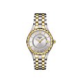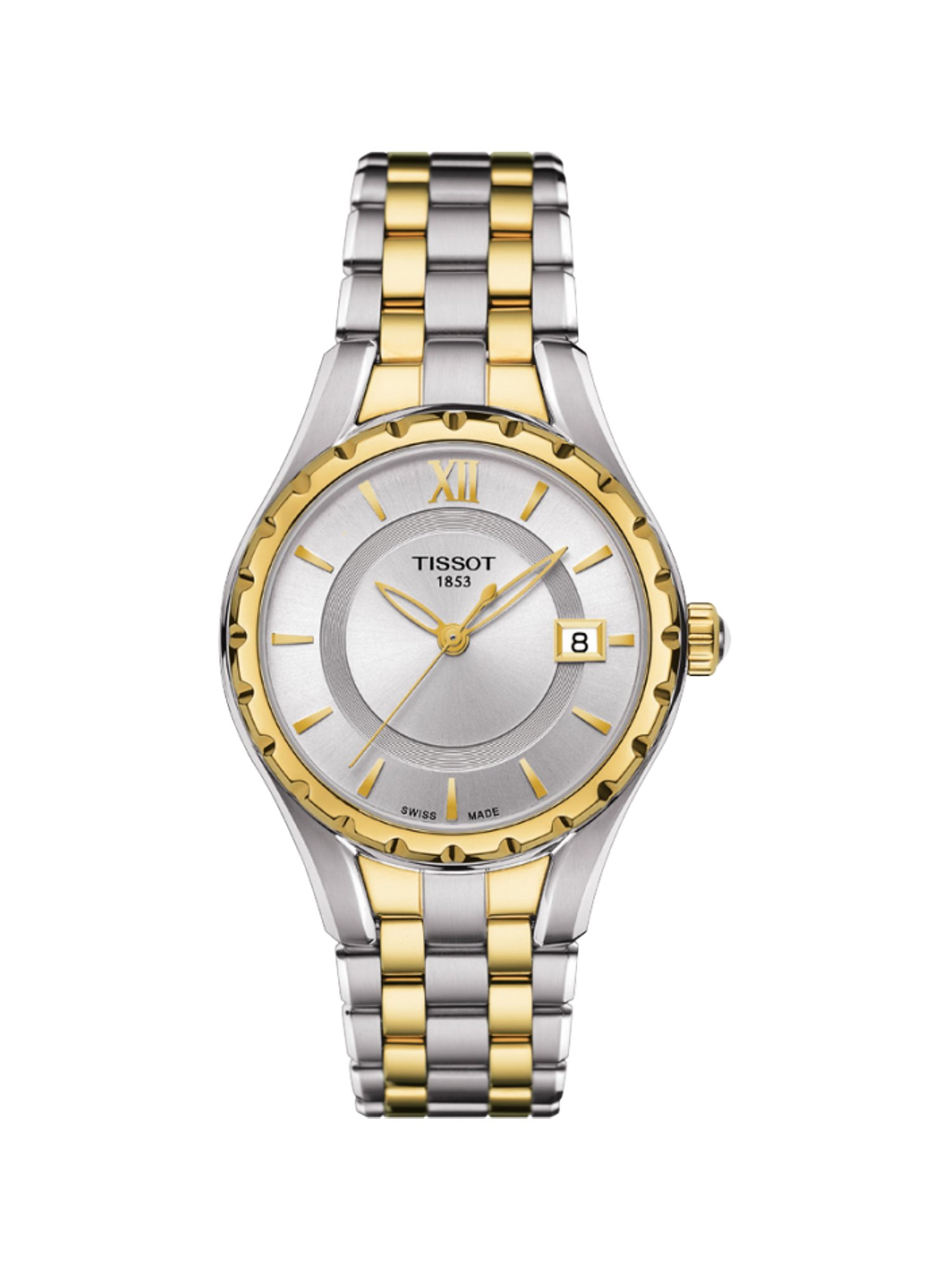 Erst auf den zweiten Blick verrät diese edle Damenuhr aus schimmerndem Edelstahl ihren sportlichen Charakter. Denn ihre silber- und goldfarbene Oberfläche gibt der noblen Kreation aus dem Hause TISSOT eine so elegante Attitüde, dass ihr vitales Design vor der strahlenden Metallic-Optik zurücktritt. Jedenfalls vorerst. Denn dann offenbaren sich die feinen Details: Das filigrane Glieder-Armband, die gezahnte Lünette und das Kreiswellen-Muster auf dem silberfarbenen Zifferblatt. Und dank des leistungsstarken analogen Quarzwerks macht der Zeitmesser auch bei kurzem Wasserkontakt eine gute Figur.