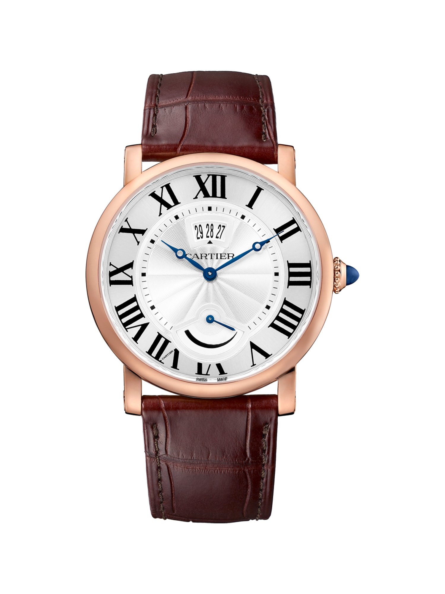 Rotonde de Cartier Uhr 40 mm, Datumsfenster und Gangreserve, mechanisches Manufakturuhrwerk mit Handaufzug, Kaliber 9753 MC. Gehäuse aus 18 Karat Roségold, Durchmesser: 40 mm, Höhe: 8,94 mm, kannelierte Krone mit Saphir-Cabochon, versilbertes guillochiertes Zifferblatt mit Datumsfenster auf 12 Uhr, Zeiger in Apfelform aus gebläutem Stahl, Armband aus braunem Alligatorleder, 18 mm doppelt verstellbare Faltschließe aus 18 Karat Roségold, Gangreserveanzeige auf 6 Uhr, wasserdicht bis 3 bar. Im Inneren der Modelle der Rotonde de Cartier Kollektion verbergen sich die hoch entwickelsten Uhrwerke der Haute Horlogerie: Astroregulator, Minutenrepetition, Astrotourbillon und große Komplikation Skelett.