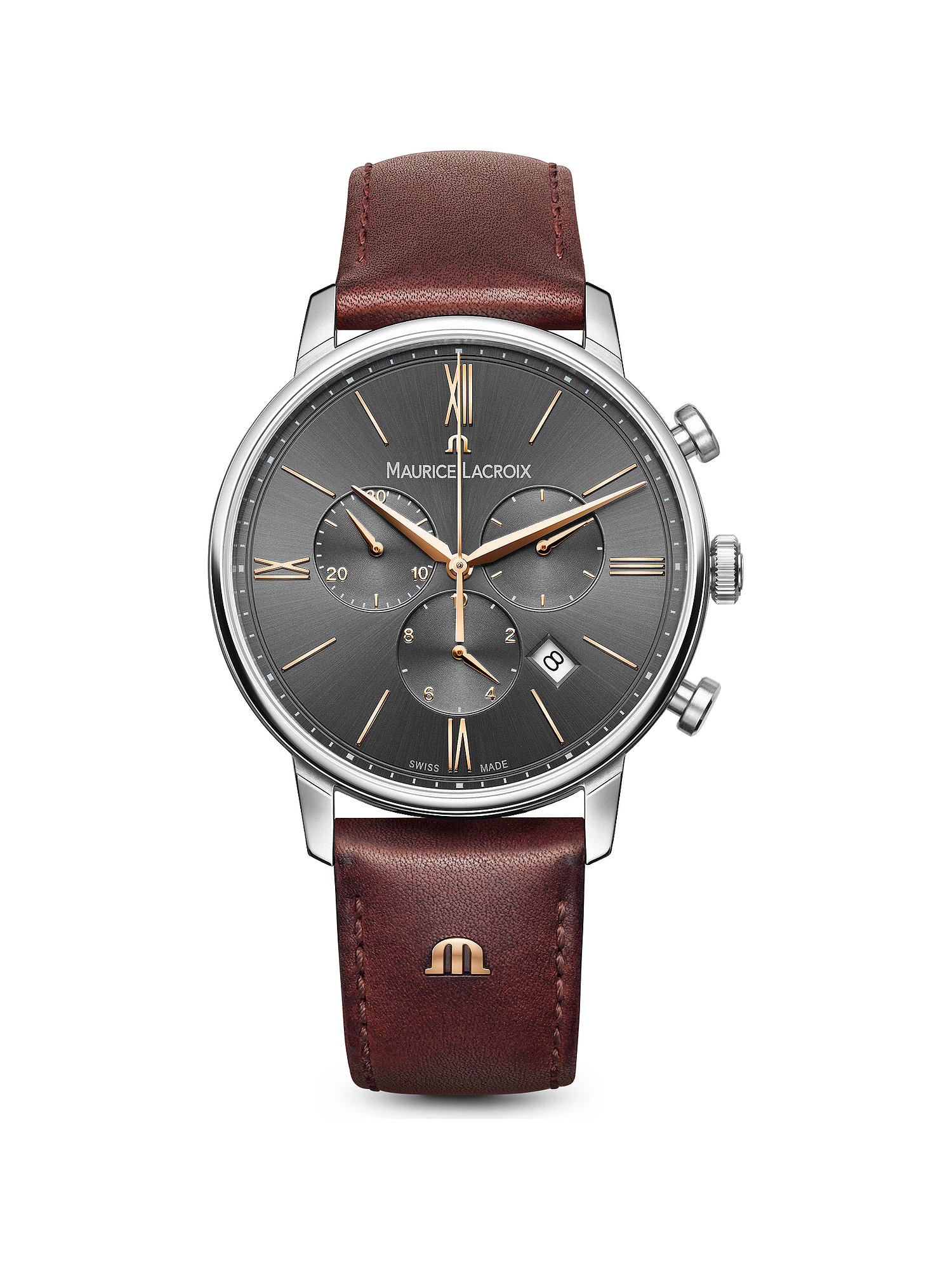 Die Uhrenmarke Maurice Lacroix steht seit über 40 Jahren für hochwertige Zeitmesser, die sich durch handwerkliche Präzision und ein einzigartiges Design auszeichnen. Lassen Sie sich von der Maurice Lacroix Eliros Date Chronograph begeistern, einem Chronographen für Anspruchsvolle, der mit ihrem Edelstahlgehäuse und Lederband sportlichen Style verkörpert. Das polierte Finish verleiht dem Gehäuse einen modernen und ausdrucksstarken Look, in den sich die Lünette harmonisch einfügt. Römische Ziffern auf dem schwarzen Blatt zeigen Ihnen die Stunden an, während sich die Zeiger deutlich davon abheben. Typisch für einen Chronographen bietet auch diese Maurice Lacroix die Komplikationen Totalisatoren, kleine Sekunde und eine Stoppfunktion. Zusätzlich können Sie eine Datumsanzeige auf dem Ziffernblatt ablesen. Das verwendete Saphirglas ist durch seine Härte enorm widerstandsfähig gegen Kratzer und bleibt viele Jahre klar. Die Uhr ist wasserdicht bis 5 bar und somit auch zum Baden geeignet. Dank des wartungsarmen und hochwertigen Quarzwerks in dieser Uhr ist absolute Präzision gewährleistet. Das Band aus Leder in klassischem Braun hält die Uhr sicher durch die Dornschließe an Ihrem Handgelenk. Als ein gelungenes Gesamtpaket aus Design und Technik wird diese Maurice Lacroix auch in etlichen Jahren noch ihren Platz als geliebter Begleiter an Ihrem Handgelenk haben.