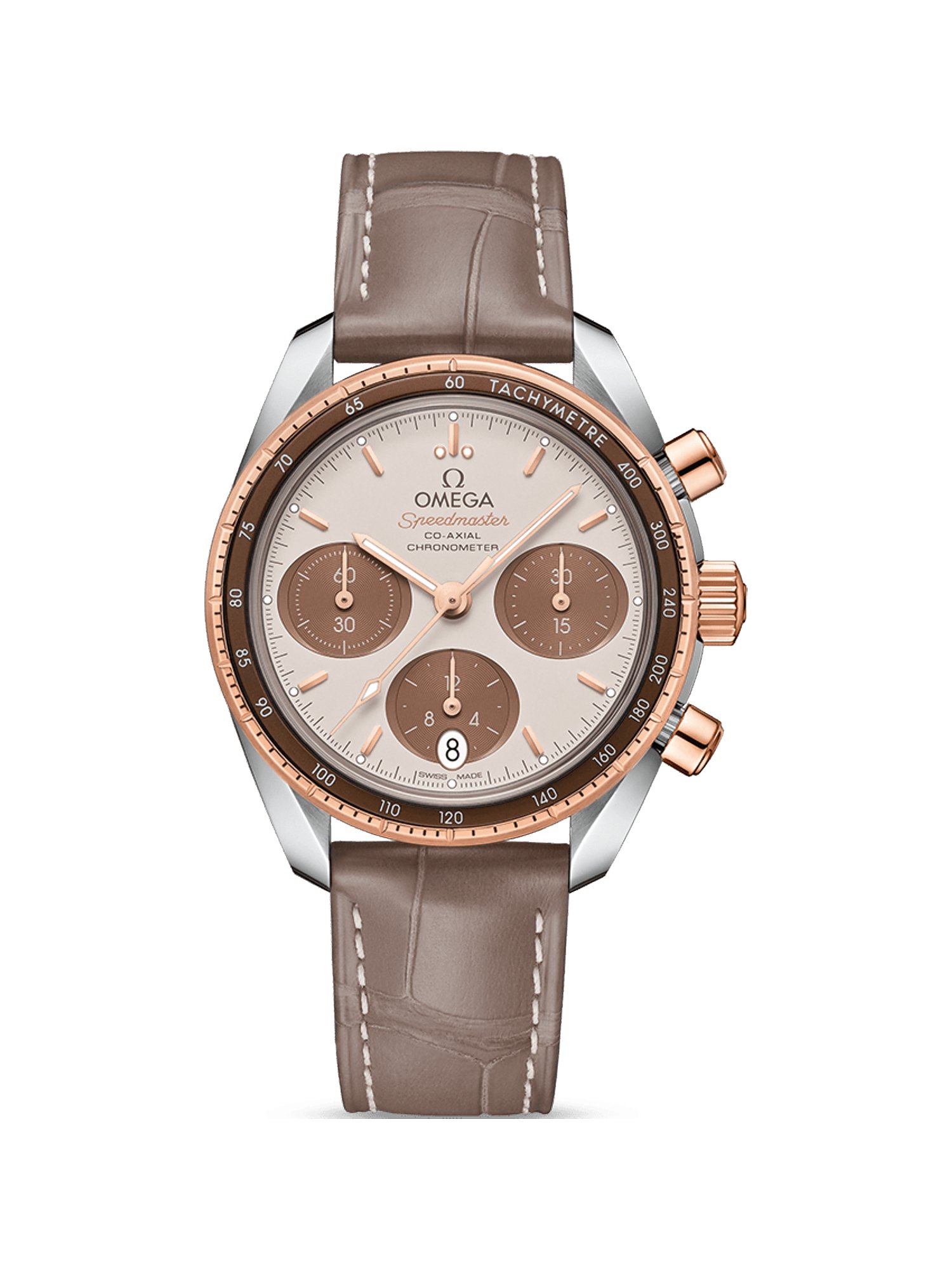 Why we love itOmega ist eine renommierte Schweizer Uhrmachermarke, die innovative Technologien mit traditionellen Designs verschmilzt. Die weltweite Luxusmarke, die in Biel ansässig ist, ist für ihre Qualität und Präzision bekannt. Seit den 60ern stehen ikonische Modelle wie die Speedmaster und die Seamaster für Uhrmacherkunst auf höchstem Niveau und gelten als Uhren, die ein Leben Lang ein geliebter Begleiter sind. Die Omega Speedmaster 38 ist der perfekte Chronograph für Herren, die bei Stil und Qualität keine Kompromisse machen wollen. Das Gehäuse aus Edelstahl mit Roségold und das Alligatorband ergänzen sich zu einer Uhr mit sportlichem Charakter. Der Gehäusedurchmesser beträgt 38 mm - je nach Vorliebe passt er so an eine Vielzahl von Handgelenken. Durch das Edelstahlgehäuse erhält die Uhr einen hochwertigen Look, dazu ergänzt sich harmonisch die Lünette in Silber und Gold. Markierungen sorgen auf dem Ziffernblatt in Beige für gute Ablesbarkeit, die Zeiger heben sich klar davon ab - für einfache Zeiterfassung auf einen Blick. Als Chronograph verfügt auch diese Omega über die Komplikationen Totalisatoren, eine Stoppfunktion und Tachymeter. Zusätzlich befindet sich noch eine Datumsanzeige auf dem Ziffernblatt. Stets guten Durchblick garantiert das kratzfeste, extrem harte Saphirglas. Durch die Wasserdichte von 10 bar ist die Speedmaster 38 die perfekte Uhr für alle, die auch beim Schwimmen oder Baden nicht auf eine elegante Uhr verzichten wollen. Das Automatikwerk zieht sich bequem selbst bei jeder Handgelenksbewegung auf. Es ist als Chronometer durch die COSC zertifiziert. Mit einer Gangreserve von bis zu 52 Stunden muss die Uhr auch dann nicht neu gestellt werden, wenn sie einige Zeit lang nicht bewegt wurde. Das Band aus Alligator in klassischem Braun hält die Uhr sicher durch die Sicherheits-Faltschließe am Platz. Alles in allem eine Omega, die nichts zu wünschen übrig lässt und auf lange Jahre hinaus zum geliebten Begleiter werden wird.