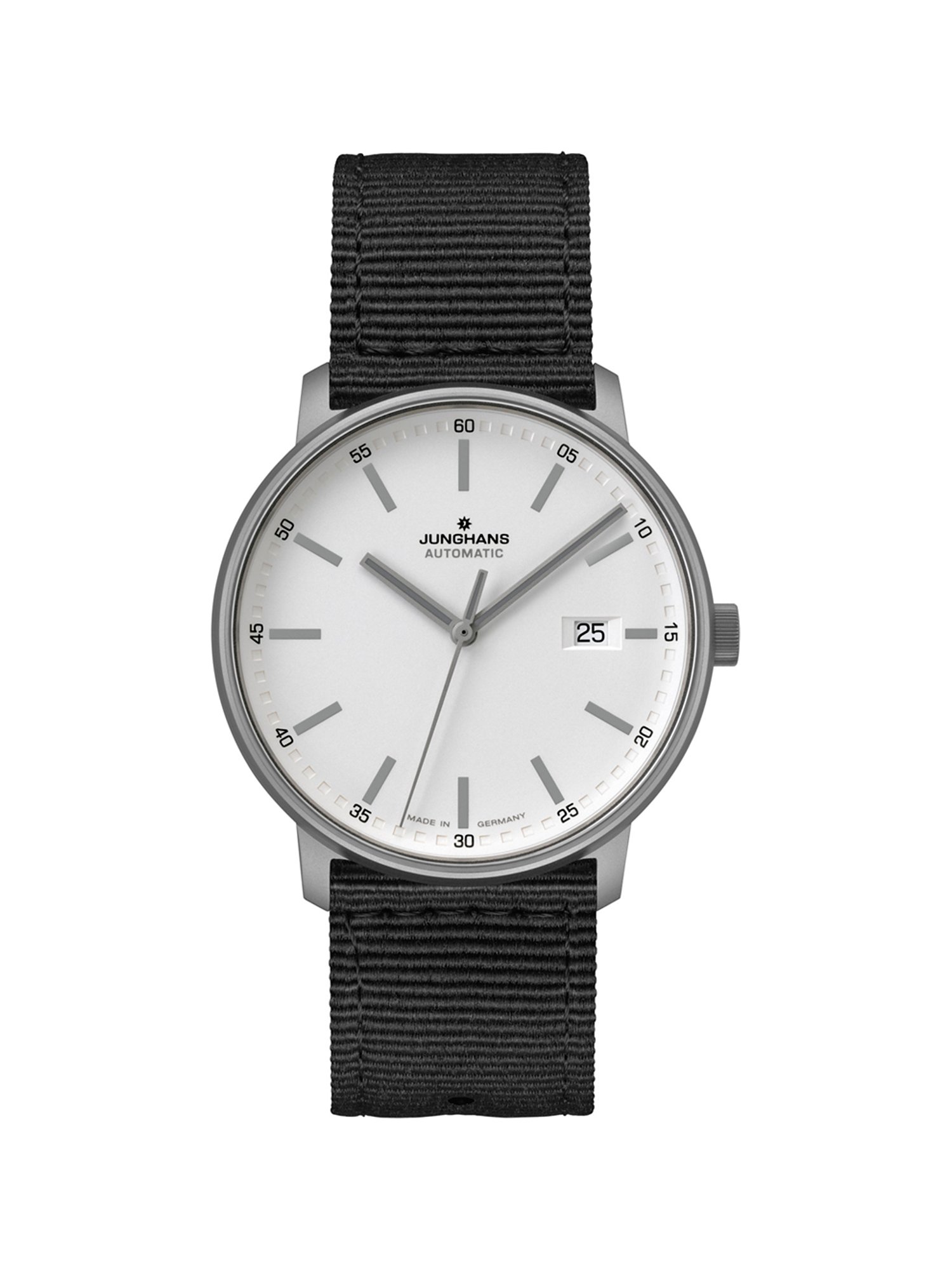 Mit über 160 Jahren Geschichte repräsentiert Junghans aus Schramberg, Deutschland, die Quintessenz deutscher Uhrenherstellung und ist berühmt für elegante Designs sowie technische Präzision in der Welt der Zeitmessung. Wenn Sie auf der Suche nach einem echten Allrounder für den Alltag, das Business und besondere Anlässe sind, dann treffen Sie mit der Herrenuhr FORM A Titan genau die richtige Wahl. Durch ihr bedingungslos formvollendetes Design passt sich die hochwertige Uhr spielerisch allen Looks an. Das widerstandsfähige, schwarze Armband aus Textil sorgt für zeitlosen Chic und bequemen Tragekomfort. Mit einem Durchmesser von 40 mm ist das Gehäuse perfekt für schmale bis mittlere Handgelenke geeignet. Das weiße Zifferblatt ist ein besonderer Blickfang, und die Leuchtzeiger garantieren Ihnen jederzeit eine leichte Ablesbarkeit. Mit diesem Zeitmesser haben Sie nicht nur die Uhrzeit, sondern auch das Datum stets im Blick. Geschützt wird das Zifferblatt von einem äußerst strapazierfähigen Saphirglas, das als das König der Uhrengläser gilt. Es ist eines der luxuriösesten Materialien der Welt, wenig schlagempfindlich und äußerst kratzresistent. Im Inneren verrichtet ein Junghans-Automatikwerk zuverlässig und präzise seine Arbeit. Der bewegliche Rotor wird durch die täglichen Bewegungen beim Tragen angetrieben, sodass kein manuelles Aufziehen erforderlich ist. Das Sichtfenster im Gehäuseboden gewährt Ihnen spannende Einblicke in das Innere der Uhr. Diese Uhr ist der ideale Begleiter für Alltag und Abenteuer - dank ihrer Wasserdichtigkeit bis 10 bar kann sie selbst beim Schwimmen am Handgelenk verbleiben! Für sicheren Halt und gute Verstellbarkeit sorgt die Dornschließe.
