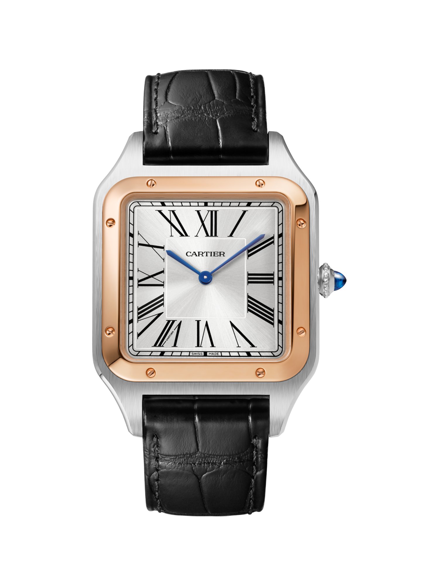 Why we love itSantos-Dumont, Modell XL, mechanisches Manufaktur-Uhrwerk mit Handaufzug, Kaliber 430 MC. Gehäuse aus Stahl, Lünette aus 750er Roségold, perlierte Krone mit einem synthetischen blauen Spinellcabochon besetzt, satiniertes silberfarbenes Zifferblatt mit Sonnenschliff, römische Ziffern, schwertförmige Zeiger aus gebläutem Stahl, Saphirglas. Armband aus Alligatorleder in Schwarz, Stiftschließe aus Stahl. Gehäuseabmessungen: 46,6 mm x 33,9 mm. Höhe: 7,5 mm. Wasserdicht bis zu 3 bar.