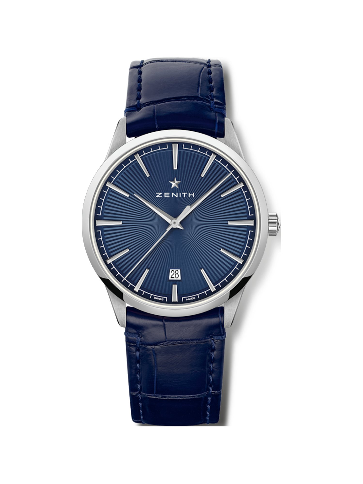 Why we love itMit der Vision vor Augen, die präziseste Uhr der Welt zu fertigen, gründete Goerges Favre-Jacot 1865 im schweizerischen Le Locle die Manufaktur Zenith. Noch heute ist die renommierte, internationale Luxusuhrenmarke im selben historischen Gebäude beherbergt – jedoch mittlerweile längst auf dem Zenit der Perfektion in Sachen Präzision angekommen. Herausragende Handwerkskunst trifft hier auf technische Innovationen und zeitlose Ästhetik und verbinden zu zu einem unverwechselbaren Stil. Für einen besonderen Hingucker sorgt diese luxuriöse Herrenuhr der Marke Zenith. Das Modell Elite Classic überzeugt mit seinem geschmackvollem Design, das mühelos jedes Outfit aufwertet. Das blaue Armband aus Alligatorleder passt ideal zum zeitlos-eleganten Stil der Uhr mit Edelstahl-Gehäuse und garantiert hohen Tragekomfort. Die Elite Classic hat einen Gehäusedurchmesser von 40,5 mm und ist deshalb perfekt geeignet für schmale bis mittlere Handgelenke. Gekonnt fügt sich das blaue Zifferblatt mit Markierungen in das harmonische Gesamtbild ein. Der Sonnenschliff des Zifferblatts unterstreicht die luxuriöse Ästhetik und sorgt für eine hohe optische Wandlungsfähigkeit in Abhängigkeit vom Lichteinfall. Mit diesem Zeitmesser behält man nicht nur die Zeit zuverlässig im Blick, sondern auch Datum und Wochentag. Für den Schutz des Zifferblattes wurde der "König der Uhrengläser" verwendet: Saphirglas. Dieses synthetische Material ist so gut wie nicht zu zerkratzen und äußerst strapazierfähig. Saphirglas ist außerdem quasi immun gegen Stöße und Schläge. Ein Automatikwerk im Inneren verrichtet zuverlässig und präzise seine Arbeit. Der bewegliche Rotor wird durch die täglichen Bewegungen beim Tragen angetrieben, so dass kein manuelles Aufziehen erforderlich ist. Das Manufakturkaliber ist das Herzstück des Zeitmessers und ein Beweis für die meisterhafte Feintechnik der Uhrmacherei aus dem Hause Zenith. Auch wenn die Uhr mal unbewegt bleibt, ist durch die Gangreserve von 50 Stunden anhaltende Präzision und Zuverlässigkeit gewährleistet. Dieses Modell verfügt über einen Saphirglasboden, durch den man das Uhrwerk bei seiner Arbeit beobachten kann. Duschen und Händewaschen sind dank einer Wasserdichte von 5 bar kein Problem. Sicheren Halt und gute Verstellbarkeit garantiert die Dornschließe.