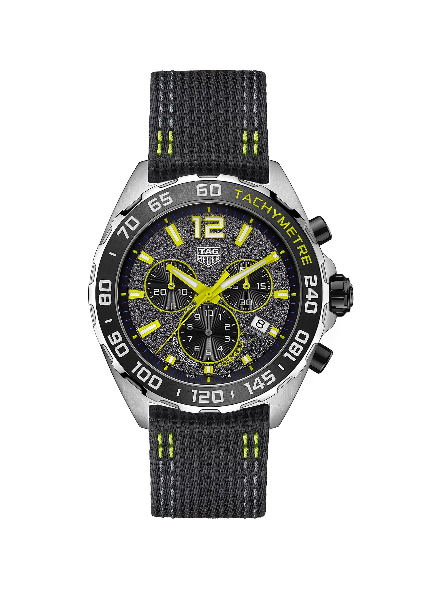 Seit mehr als 160 Jahren dürfen Sie TAG Heuer als einen der renommiertesten Schweizer Uhrenhersteller kennenlernen. Die Marke aus La Chaux-de-Fonds begeistert Sie mit Luxuszeitmessern in rasanten Designs, die Stil und Qualität vereinen. Die TAG Heuer Formula 1 ist die optimale Uhr für Sie, wenn Sie bei Stil und Qualität keine Kompromisse eingehen möchten. Das Edelstahlgehäuse und das Nylonband ergänzen sich zu einem Racing-Chronographen mit dynamischem Charakter, der perfekt an Ihr Handgelenk passt - der Gehäusedurchmesser von 43 mm ermöglicht dies. Durch das gebürstete Finish erhält das Gehäuse einen modernen und ausdrucksstarken Look, harmonisch ergänzt von der schwarzen Lünette. Auf dem Ziffernblatt in Anthrazit sorgen Leuchtindizes für hervorragende Ablesbarkeit, selbst bei ungünstigen Lichtverhältnissen, während die Leuchtzeiger aus hell strahlender Leuchtmasse klar hervorstechen. Typisch für einen Chronographen zeigt auch diese TAG Heuer die Komplikationen Tachymeter, Totalisatoren, kleine Sekunde und eine Stoppfunktion. Zudem befindet sich eine Datumsanzeige auf dem Ziffernblatt. Das verwendete Saphirglas ist durch seine Härte enorm widerstandsfähig gegen Kratzer und bleibt viele Jahre klar. Mit einer Wasserdichte von 20 bar ist die Formula 1 bestens gerüstet für Ihre Abenteuer, ob auf oder unter Wasser. Krone und Gehäuseboden sind verschraubt, was diese Motorsportuhr zu einem verlässlichen Begleiter macht, der höchsten Ansprüchen gerecht wird. Durch das wartungsarme und hochwertige Quarzwerk in dieser Uhr ist absolute Präzision gewährleistet. Das Band aus Nylon in klassischem Schwarz hält die Uhr sicher durch die Dornschließe an ihrem Platz. Insgesamt also eine TAG Heuer, die Ihnen lange Freude bereiten wird und auch in vielen Jahren noch für Begeisterung sorgt.