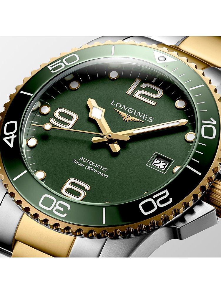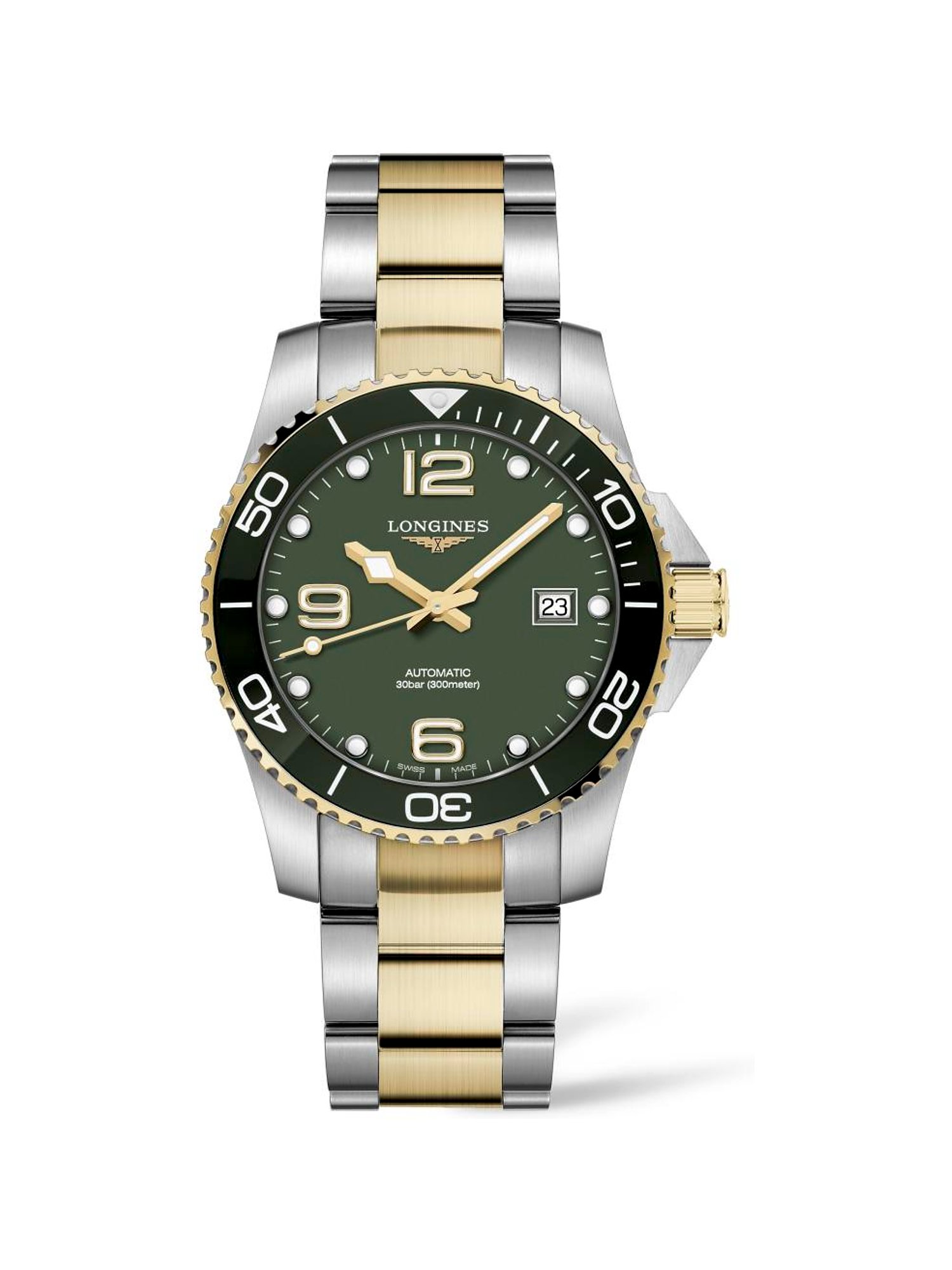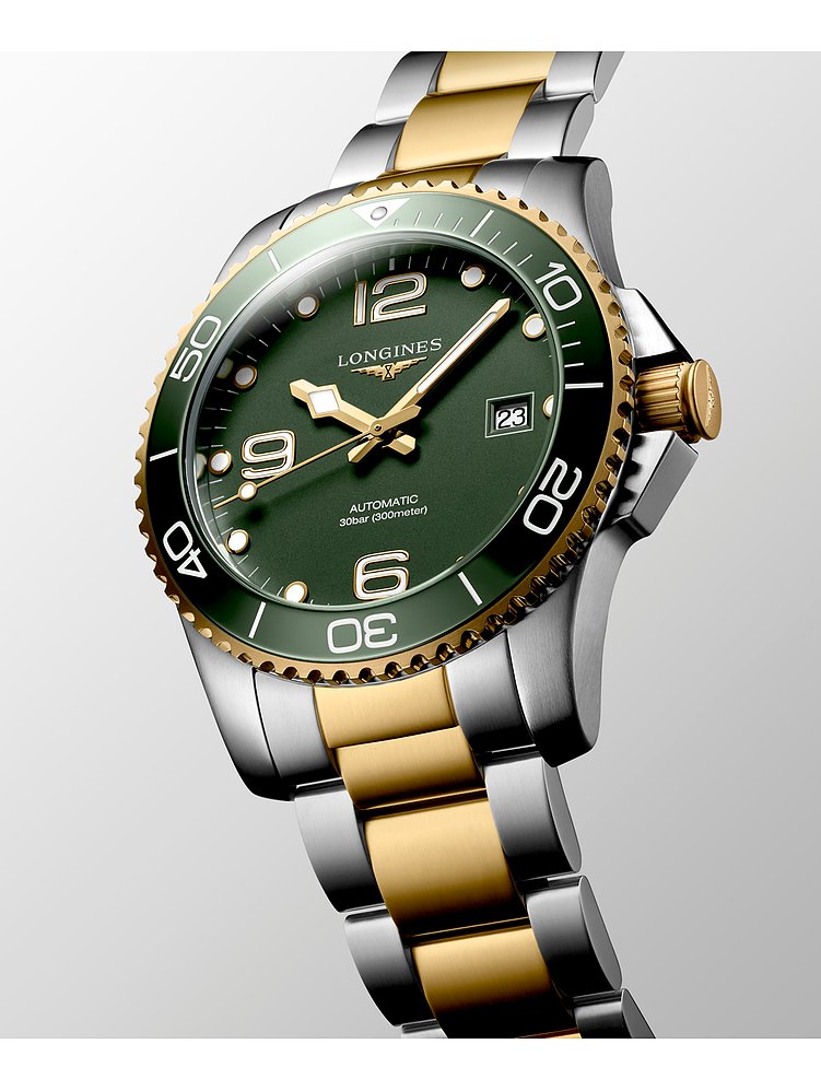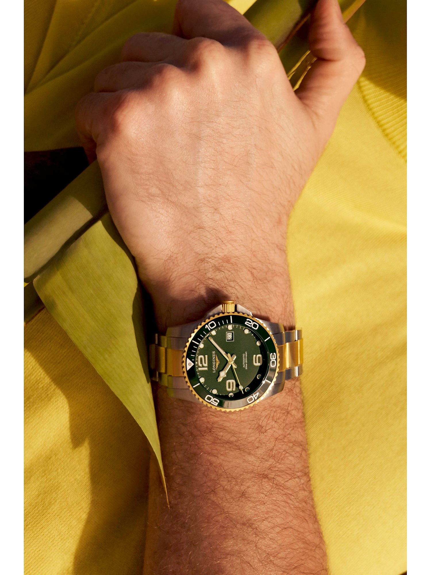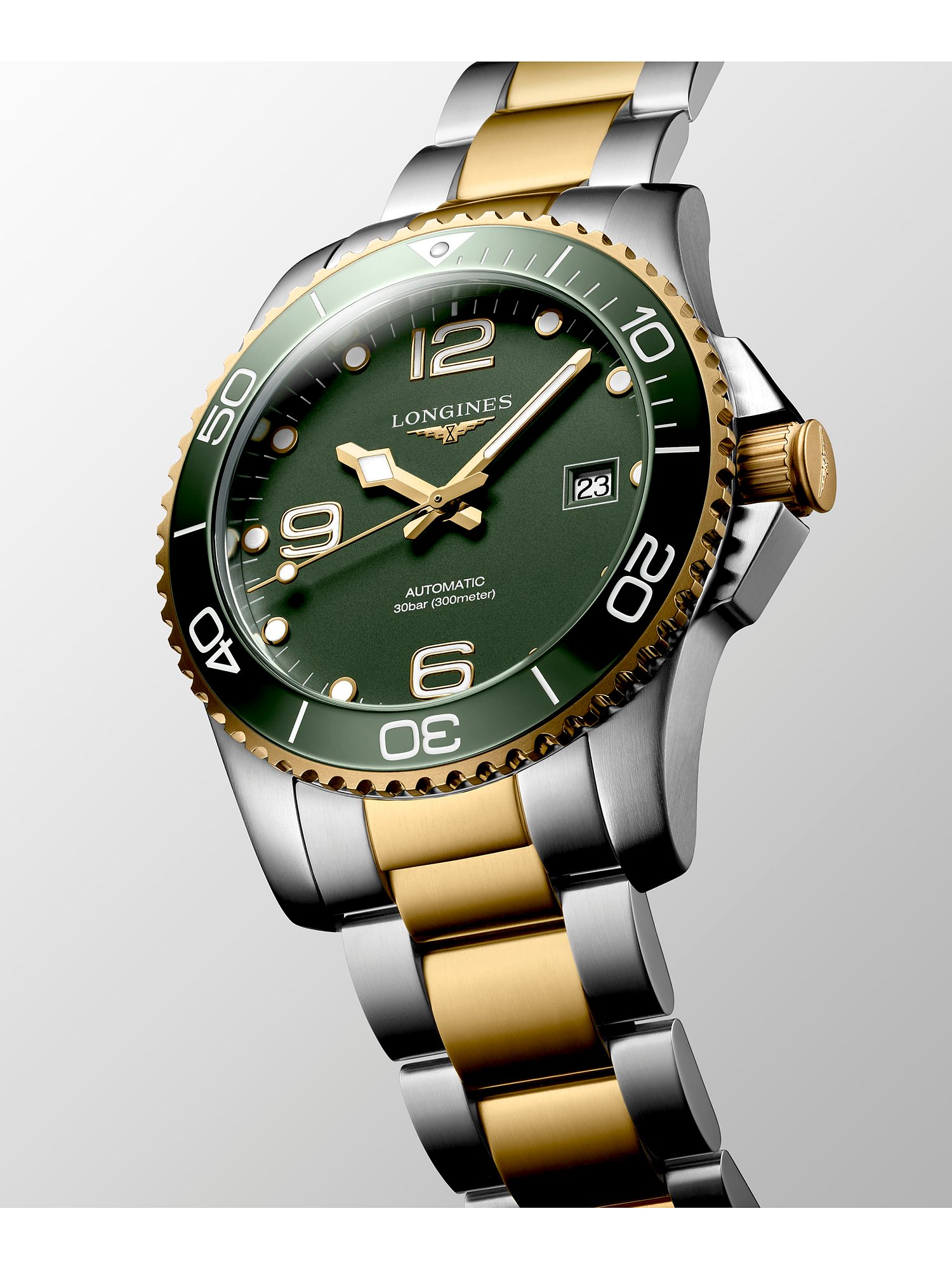 Seit 1832 begeistern die Zeitmesser der Schweizer Uhrenmarke HydroConquest durch ihre elegante Optik, ihr raffiniertes Design und ihre technische Präzision. Die Longines HydroConquest, eine Taucheruhr für den anspruchsvollen Herren, bietet Ihnen mit ihrem Edelstahlgehäuse und Edelstahlband einen sportiven Style. Ein echter Hingucker ist die Uhr durch den Bicolor-Look, der kühlen Glanz mit warmem Schimmer an Ihr Handgelenk bringt. Mit einem Gehäusedurchmesser von 41 mm und einer Gehäusehöhe von 11,9 mm ist diese Uhr zwar auffälliger und dicker, dennoch passt sie an eine Vielzahl von Handgelenken. Die Oberfläche ist mit einer hochwertigen und beständigen Beschichtung in der Farbe bicolor veredelt, in die sich die Lünette harmonisch einfügt. Auf dem Ziffernblatt in Grün sorgen Markierungen für gute Ablesbarkeit, während sich die Zeiger deutlich davon abheben. Ein extrem hartes und kratzfestes Saphirglas sorgt für ungehinderte Sicht. Die HydroConquest hat eine Wasserdichte von 30 bar und ist damit bestens für alle Abenteuer auf und unter Wasser geeignet - ideal für Sie, wenn Sie Segel- oder Tauchbegeisterter sind. Das verbaute Automatikwerk zieht sich selbst bei jeder Handgelenkbewegung auf. Das Armband ist mit einer haltbaren und hochwertigen PVD-Beschichtung in der Farbe bicolor veredelt. Als luxuriöser Begleiter wird Ihnen diese Longines auf viele Jahre hinaus Freude bereiten.