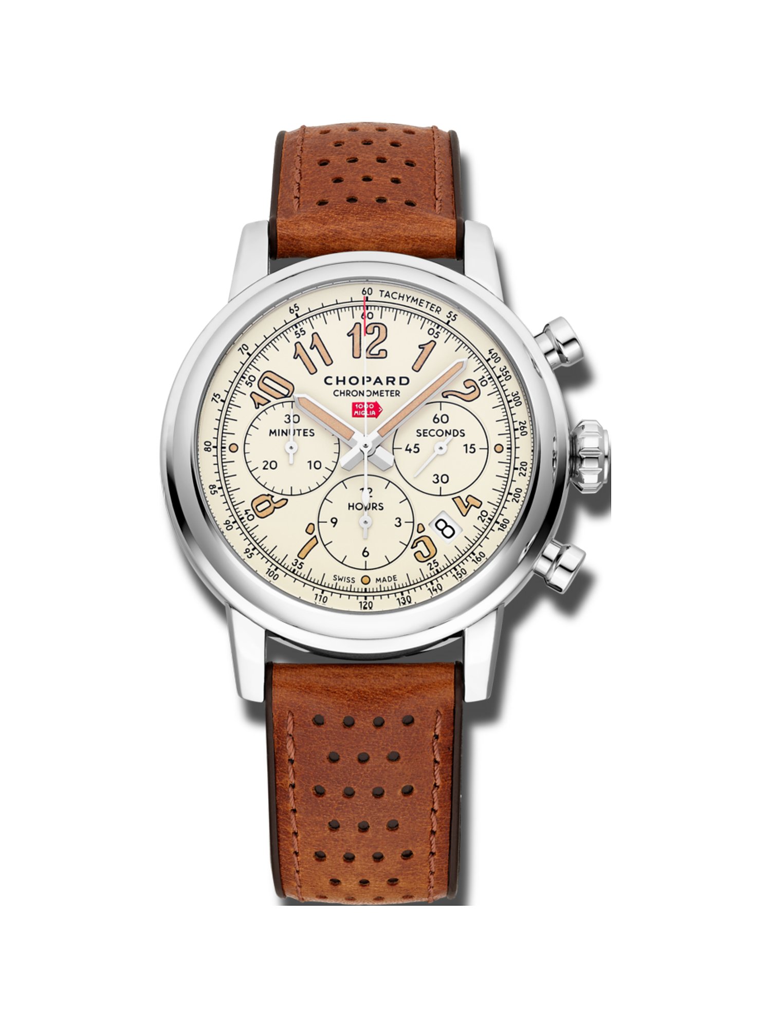 Für alle, die es gerne exklusiv, sportlich und edel mögen, hat Chopard die Mille Miglia Raticosa Limited Edition im Programm. Ein rarer Klassiker, der sowohl mit seinem Design als auch mit technischer Finesse Ihren Alltag bereichert. Das changierende Ziffernblatt wechselt je nach Lichteinfall von Karamell bis zu einem warmtonigen Offwhite und stellt so einen harmonischen Kontrast zum cognacbraunen Lederband mit stylishem Lochmuster dar.