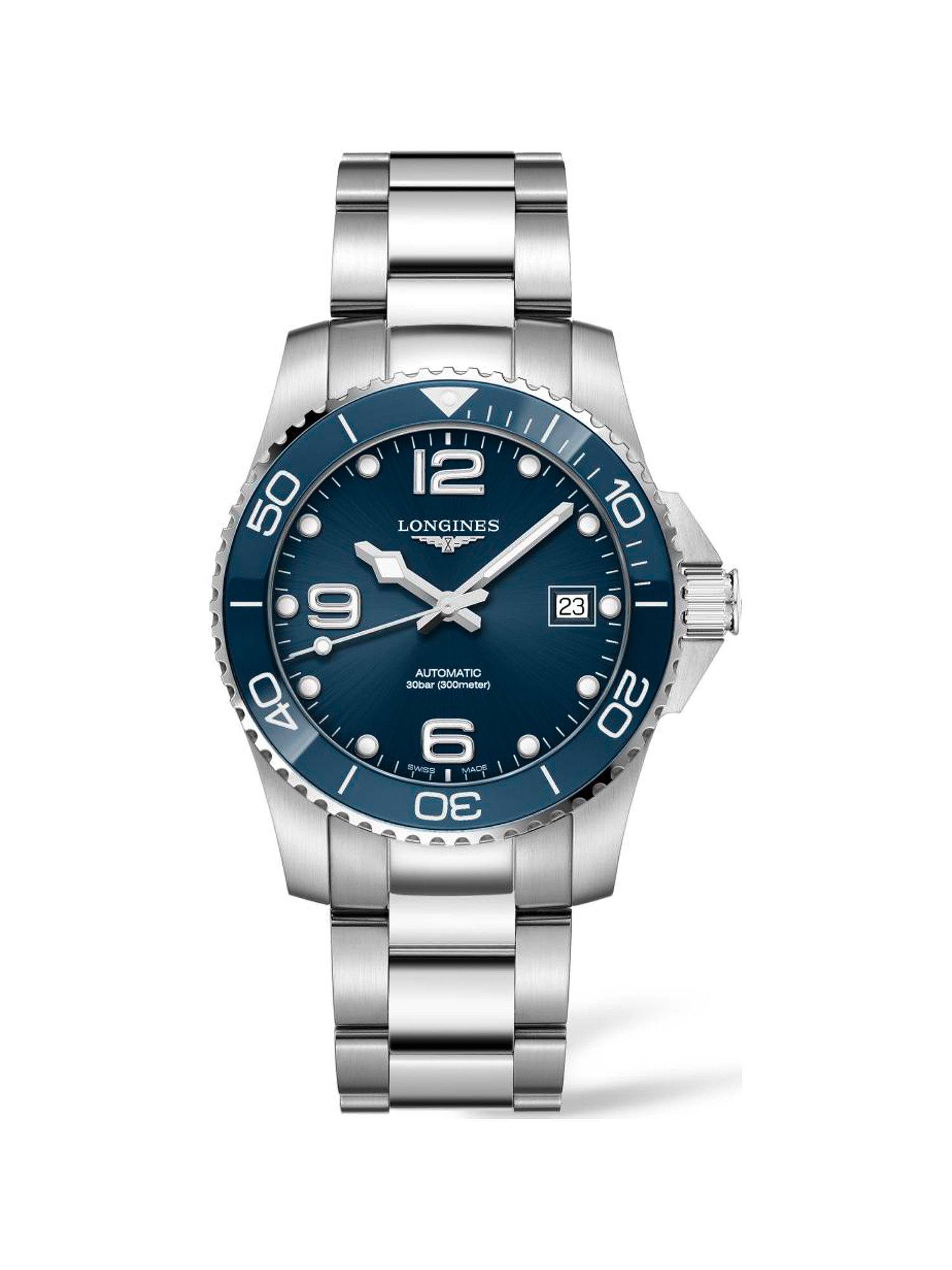 Seit 1832 begeistern die Zeitmesser der traditionsreichen Schweizer Uhrenmarke Longines mit ihrer ausgeprägten Eleganz, ihrem raffinierten Design und technischer Präzision. Die Longines HydroConquest ist die optimale Uhr für Sie, wenn Sie bei Stil und Qualität genau wissen, was Sie wollen. Das Gehäuse aus Edelstahl mit Keramik und das Edelstahlband verschmelzen zu einer Taucheruhr mit dynamischem Charakter. Obwohl diese Uhr mit einem Gehäusedurchmesser von 39 mm und einer Gehäusehöhe von 12,2 mm auffälliger und dicker ist, passt sie dennoch an eine Vielzahl von Handgelenken. Das Gehäuse aus massivem Edelstahl ist robust und verleiht der Uhr ihren klassisch-sportlichen Look, in den sich die Lünette harmonisch einfügt. Das Ziffernblatt ist blau, die Zeiger heben sich klar davon ab, sodass Sie die Zeit auf einen Blick mühelos erfassen können. Ein extrem hartes und kratzfestes Saphirglas sorgt für ungehinderte Sicht. Mit einer Wasserdichte von 30 bar ist die HydroConquest bestens gerüstet für Ihre Abenteuer auf und unter Wasser. Krone und Gehäuseboden sind verschraubt – alles in allem eine Taucheruhr, die höchsten Ansprüchen gerecht wird. Das Herzstück der Uhr ist das exzellente Automatikwerk, das sich durch Ihre Bewegung selbst aufzieht. Das Stahlband wird durch eine Sicherheits-Faltschließe sicher an Ihrem Arm gehalten. In Summe also eine Longines, wie sie im Buche steht und die auch in etlichen Jahren noch für Begeisterung sorgen wird.