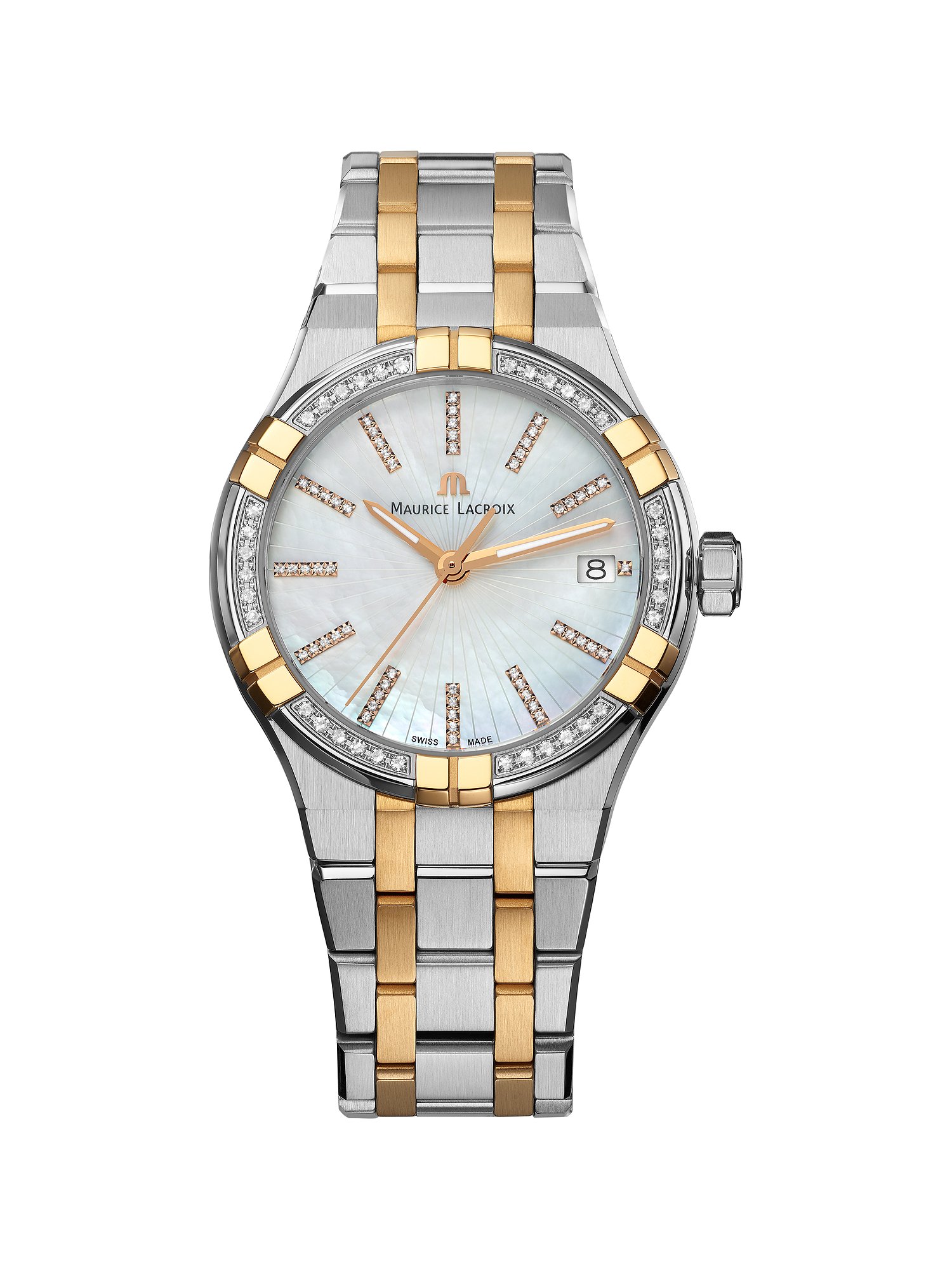 Seit über 40 Jahren steht der traditionelle Schweizer Uhrenhersteller Maurice Lacroix für Zeitmesser erster Güte, die durch handwerkliche Präzision und einzigartiges Design bestechen. Wenn Sie auf der Suche nach einem wahren Allrounder für den Alltag, das Business und besondere Anlässe sind, treffen Sie mit der Damenuhr Aikon Quarz genau die richtige Wahl. Durch ihr bedingungslos geschmackvolles Design fügt sich die hochklassige Uhr mit Edelstahl-Gehäuse problemlos in alle Looks ein. Auch das zweifarbige Armband aus Edelstahl und PVD-Beschichtung sorgt für zeitlosen Chic und bequemen Tragekomfort. Die Aikon Quarz ist die perfekte Uhr für Damen mit schmalem Handgelenk. Das perlmuttfarbene Zifferblatt harmoniert ausgezeichnet mit dem Gesamtdesign der Uhr. Die 56 funkelnden Diamanten auf dem Zifferblatt perfektionieren die noble Optik auf glamouröse Art. Die Leuchtzeiger garantieren eine leichte Ablesbarkeit. Diese Uhr ist nicht nur elegant, sondern auch praktisch: Sie zeigt nicht nur die Uhrzeit an, sondern informiert Sie auch über das Datum. Ein besonderes Highlight ist die zweifarbige Lünette aus Edelstahl, die mit Brillanten für eine Extraportion Glamour verziert wurde. Um das Zifferblatt zu schützen, wurde der König der Uhrengläser verwendet: Saphirglas. Dieses synthetische Material ist kaum zu zerkratzen und äußerst robust. Saphirglas ist quasi immun gegen Stöße und Schläge. Das Ronda-Quarzwerk im Inneren sorgt für zuverlässige Präzision. Mit einer Wasserdichtigkeit von bis zu 10 bar ist die Uhr im Alltag und bei Abenteuern der ideale Begleiter: Sogar Schwimmen ist unbesorgt möglich! Die Butterfly-Faltschließe sorgt nicht nur für sicheren Halt, sondern lässt sich auch gut in der Größe verstellen. Mehr Variabilität geht nicht: Durch das leicht austauschbare Armband lässt sich der Look der Uhr ganz einfach anpassen.