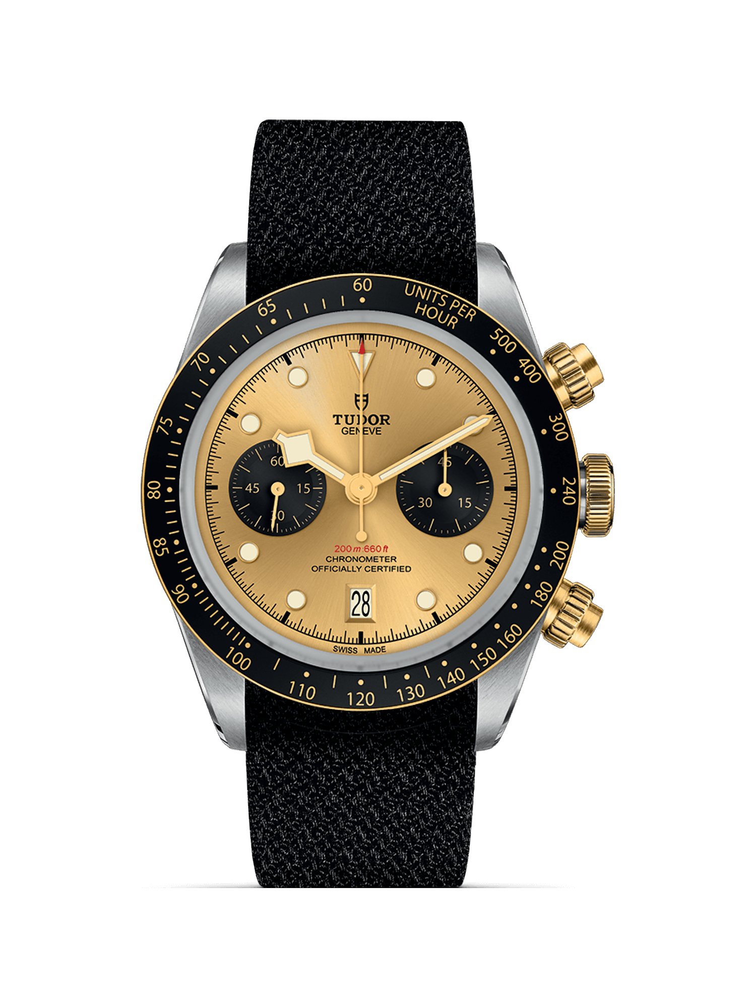Seit 1926 stehen TUDOR Uhren für ausdrucksstarkes Design und feine Schweizer Uhrmacherkunst. Egal, für welches Modell Sie sich entscheiden: Eine TUDOR am Handgelenk ist immer ein Statement für Stil und Eleganz und wird Sie ein Leben lang begleiten. Für Herren, die in Sachen Stil und Qualität keine Abstriche machen möchten, ist die Tudor Black Bay Chrono S&G die optimale Wahl. Dieser sportliche Chronograph kombiniert ein robustes Edelstahl- und Gelbgoldgehäuse mit einem sportlichen Textilband. Der Gehäusedurchmesser beträgt 41 mm und passt je nach Vorliebe an eine Vielzahl von Handgelenken. Durch das teilmattierte Finish erhält das Gehäuse einen modernen und ausdrucksstarken Look, der harmonisch von der schwarzen Lünette ergänzt wird. Auf dem Ziffernblatt in Schwarz sorgen Leuchtindizes für eine leichte Ablesbarkeit, auch bei ungünstigen Lichtverhältnissen, während die Leuchtzeiger aus hell strahlender Leuchtmasse klar abheben. Der Chronograph zeigt die typische Komplikation Tachymeter und das Ziffernblatt verfügt ebenfalls über eine Datumsanzeige. Das verwendete Saphirglas ist extrem hart, kratzfest und langlebig. Mit einer Wasserdichte von 20 bar ist die Black Bay Chrono S&G bestens gerüstet für Abenteuer auf und unter Wasser. Krone und Gehäuseboden sind verschraubt, wodurch Sie sich auf eine Sportuhr verlassen können, die höchsten Ansprüchen gerecht wird. Das Herzstück der Automatikuhr ist das Swiss Made-Manufakturwerk, das in der Black Bay Chrono S&G von Tudor verbaut wird. Eine COSC-Zertifizierung als Chronometer belegt die exzellente Ganggenauigkeit. Mit einer beeindruckenden Gangreserve von 70 Stunden kann die Uhr mehrere Tage lang ungetragen bleiben, ohne neu gestellt werden zu müssen. Das Band aus klassischem schwarzem Textil hält die Uhr sicher durch die Dornschließe am Platz. Alles in allem ist die Tudor eine Uhr, die nichts zu wünschen übrig lässt und auf lange Jahre hinaus zu Ihrem geliebten Begleiter werden wird.
