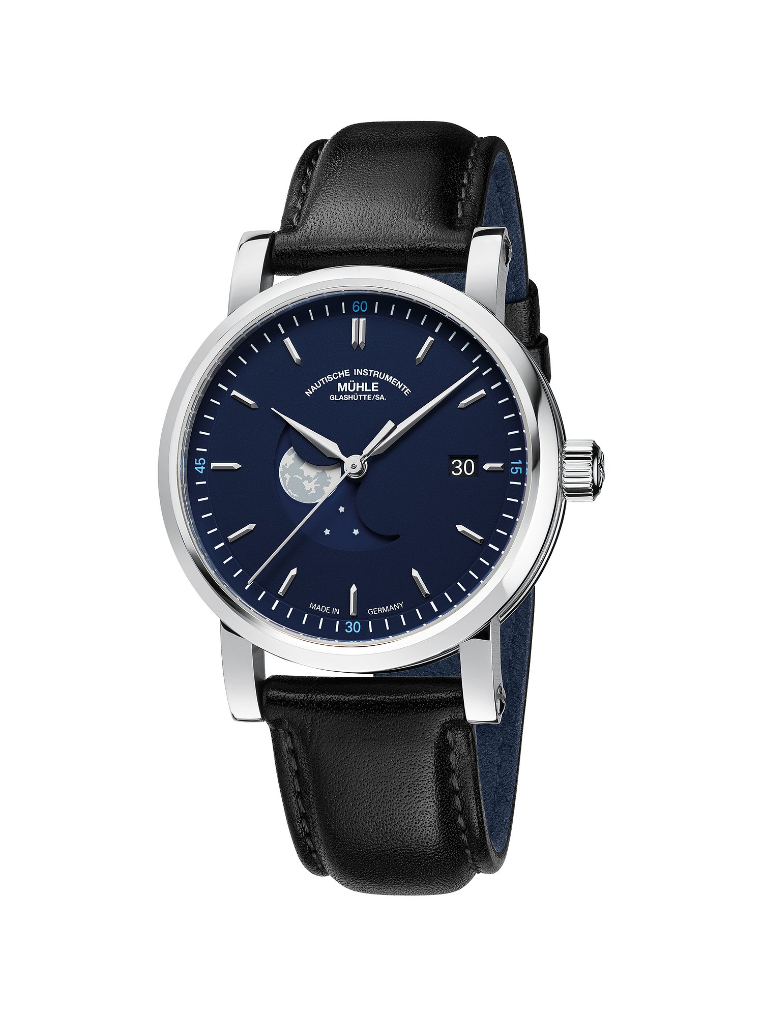 Mühle-Glashütte steht für präzise Zeitmessung seit 1861. Wie kaum eine andere Uhrenmarke repräsentiert dieses sächsische Traditionsunternehmen die nautischen Tugenden Präzision, Robustheit und gute Ablesbarkeit. Diese Eigenschaften werden vor allem durch die besonders stoßsichere Mühle-Feinregulierung, klar gezeichnete Ziffernblätter und die aufwendige Regulierung nach Chronometernorm garantiert. Ein echter Eyecatcher für Sie ist die Teutonia. Diese luxuriöse Herrenuhr übt mit ihrem chicen Design in bester Qualität eine unwiderstehliche Anziehungskraft aus und fügt sich harmonisch in jedes Outfit ein. Das schwarze Armband aus Kalbleder schmiegt sich angenehm um Ihr Handgelenk und perfektioniert den zeitlosen Look der Uhr. Durch den Gehäusedurchmesser von 39 mm ist die Teutonia an schmalen und mittleren Handgelenken gleichermaßen gut zu tragen. Das dunkelblaue Zifferblatt fügt sich gekonnt in das Design der Uhr ein. Mit der Mondphasen-Anzeige zeigt das Ziffernblatt eine besonders elegante und aufwändige Komplikation. Äußerst praktisch: Neben der Uhrzeit verrät ein Blick auf die Uhr auch das Datum. Das stilvolle Design wird durch eine silberne Lünette abgerundet. Um das Zifferblatt zu schützen, wurde der König der Uhrengläser verwendet: Saphirglas. Dieses synthetische Material ist kaum zu zerkratzen und äußerst robust. Saphirglas ist quasi immun gegen Stöße und Schläge. Ein Automatikwerk im Inneren verrichtet zuverlässig und präzise seine Arbeit. Der bewegliche Rotor wird durch Ihre täglichen Bewegungen beim Tragen angetrieben, so dass kein manuelles Aufziehen erforderlich ist. Dieses Modell verfügt über einen Saphirglasboden, durch den Sie das Uhrwerk bei seiner Arbeit beobachten können. Die Uhr ist bis 10 bar wasserdicht und somit der ideale Begleiter für Alltag und Abenteuer: Sogar Schwimmen ist unbesorgt möglich! Die Butterfly-Faltschließe garantiert einen festen Sitz und lässt sich gut anpassen. Ein weiterer Pluspunkt: Dank des austauschbaren Armbands lässt sich der Style der Uhr im Handumdrehen verändern.