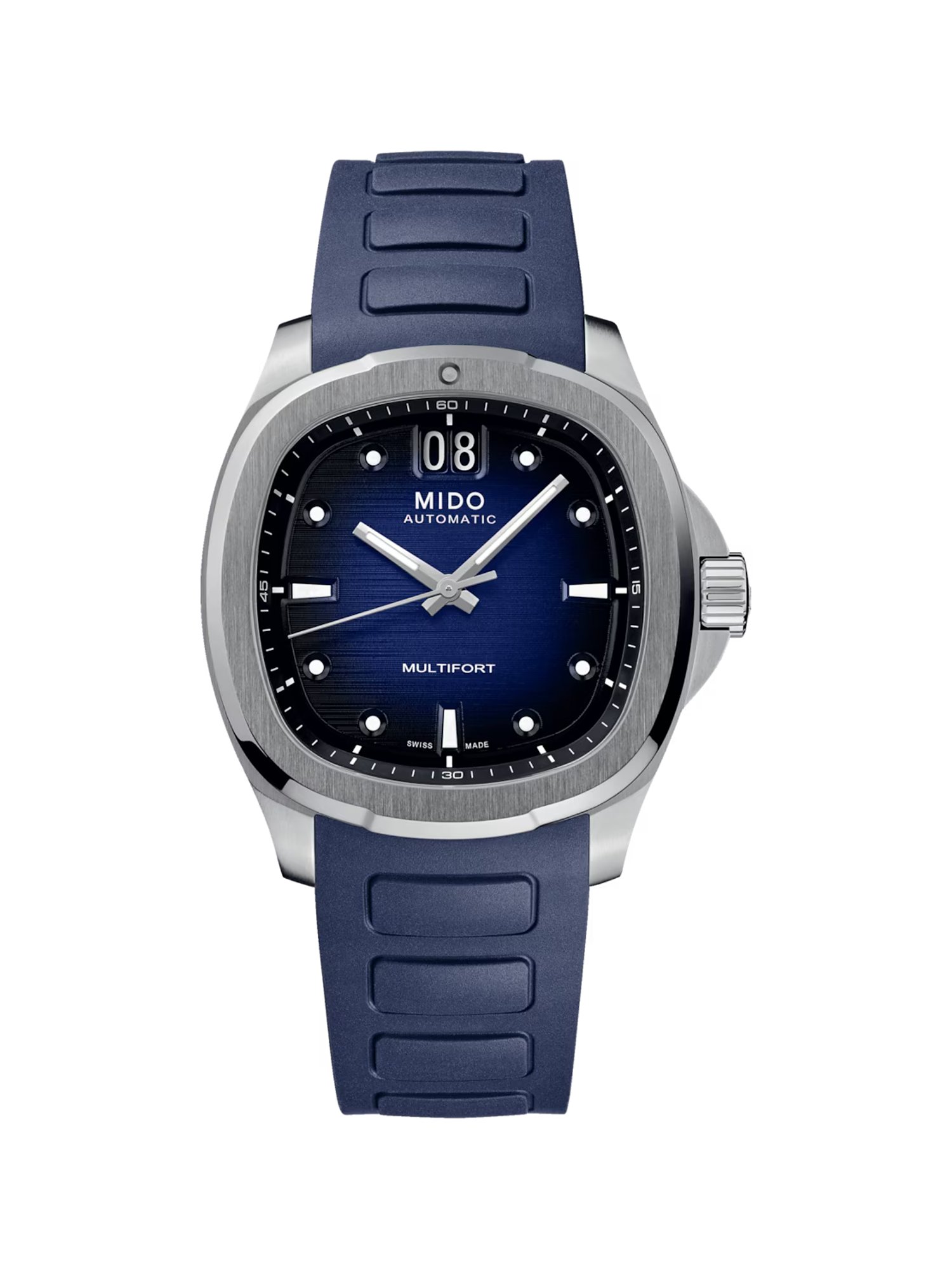 Innovation, Ästhetik und Funktionalität – das sind die Werte, für die die Zeitmesser von Mido stehen. Mit ihrem klaren Design strahlt die Uhr eine elegante Ausstrahlung aus und wird zum echten Blickfang. Sollten Sie auf der Suche nach einem wahren Allrounder für den Alltag, das Business oder besondere Anlässe sein, ist die Herrenuhr Multifort genau die richtige Wahl für Sie. Ihr bedingungslos geschmackvolles Design passt sich spielerisch allen Looks an und verleiht jedem Outfit das gewisse Etwas. Das strapazierfähige, blaue Armband aus Kautschuk sorgt für zeitlosen Chic und angenehmen Tragekomfort. Das harmonisch in das Design eingegliederte blaue Zifferblatt garantiert jederzeit eine gute Ablesbarkeit, unterstützt von den Leuchtzeigern und Leuchtindizes. Diese Uhr ist nicht nur elegant, sondern auch äußerst praktisch: Sie zeigt Ihnen nicht nur die Uhrzeit, sondern auch das Datum an. Für den Schutz des Zifferblattes kommt der König der Uhrengläser zum Einsatz: Saphirglas. Dieses hochwertige Material ist nahezu unzerkratzbar und äußerst widerstandsfähig. Zudem ist Saphirglas praktisch immun gegen Stöße und Schläge. Das Eta-Automatikwerk bietet Ihnen ein zuverlässiges und präzises Uhrwerk. Der bewegliche Rotor wird durch Ihre täglichen Bewegungen angetrieben, sodass kein manuelles Aufziehen erforderlich ist. Mit einer beeindruckenden Gangreserve von 80 Stunden sorgt die Uhr auch dann für leistungsfähiges Durchhaltevermögen, wenn sie einmal längere Zeit nicht getragen wird. Durch das Sichtfenster im Gehäuseboden erhalten Sie spannende Einblicke in das Innere der Uhr. Wasserdicht bis 10 bar ist diese Uhr Ihr idealer Begleiter im Alltag und bei Abenteuern: Sogar Schwimmen ist unbesorgt möglich! Die Dornschließe verspricht Ihnen nicht nur sicheren Halt, sondern auch eine gute Verstellbarkeit.