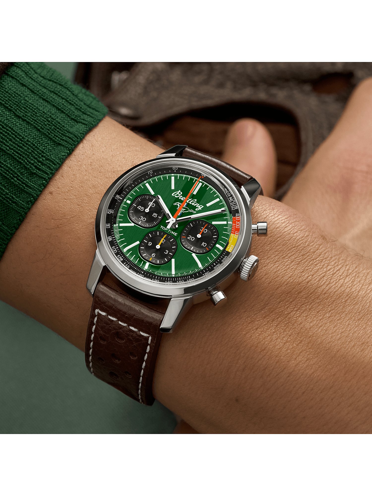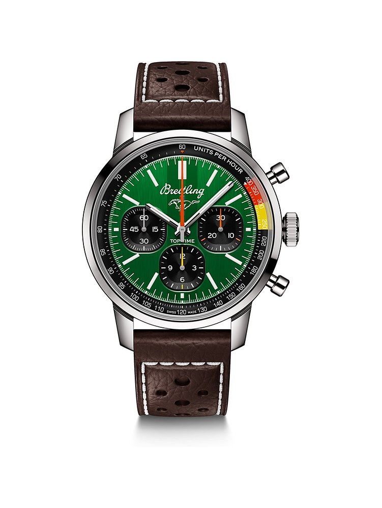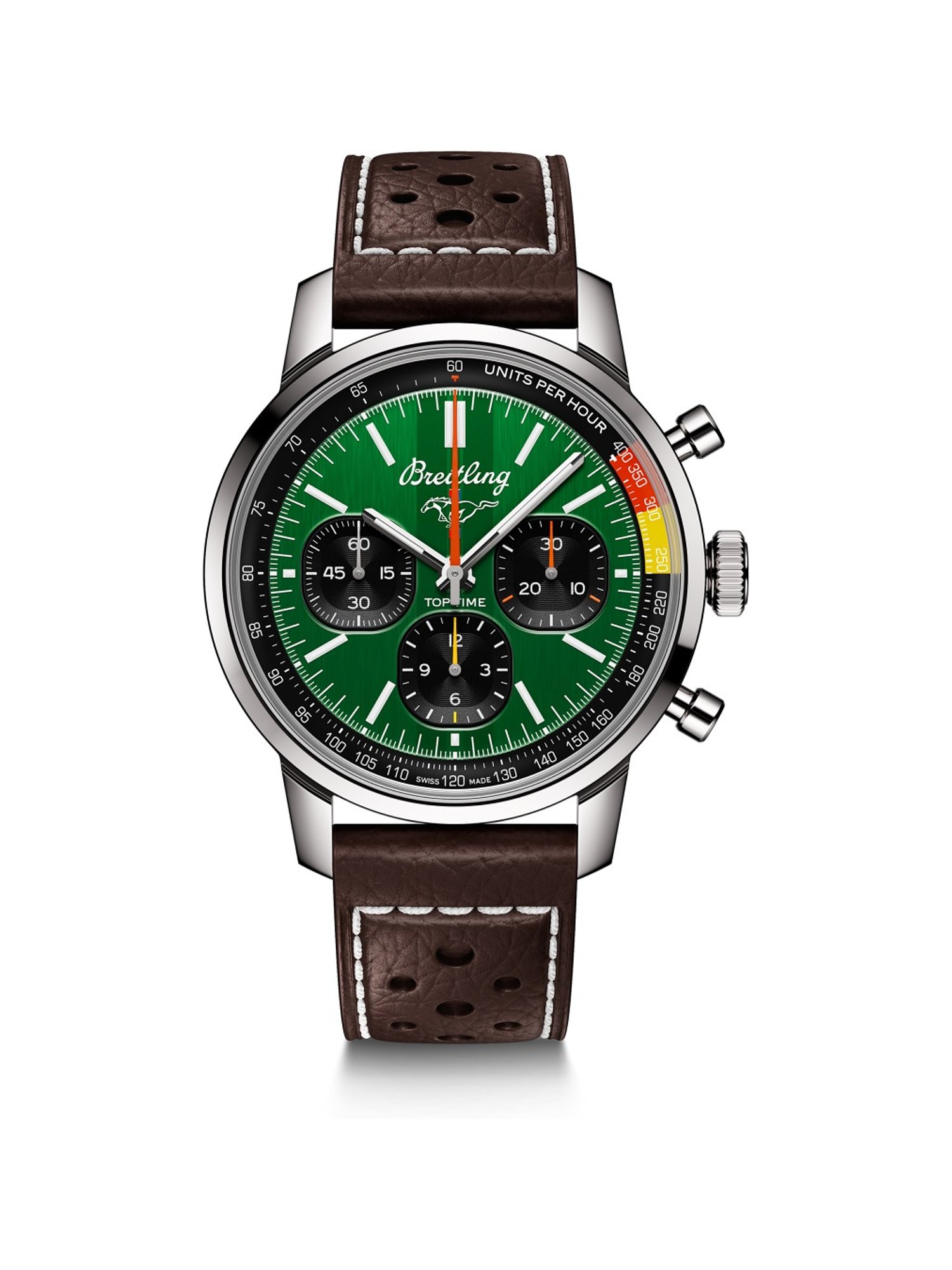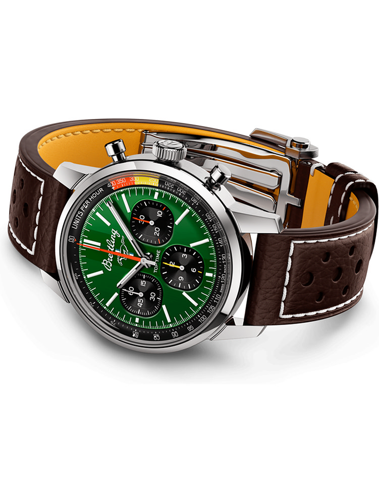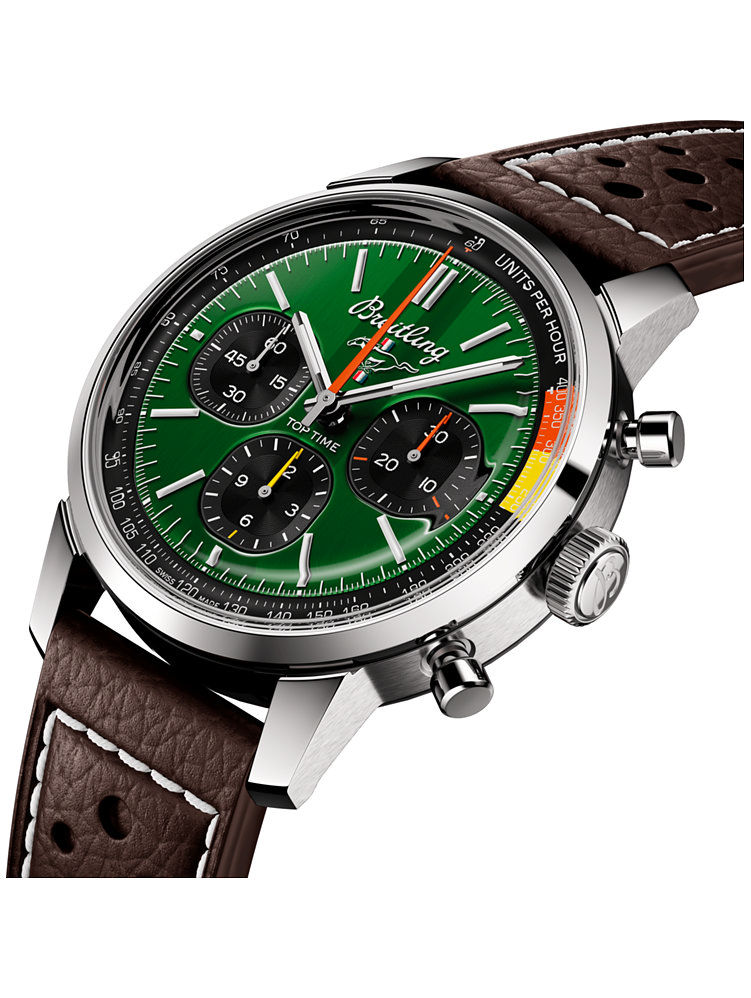 Breitling Uhren sind Meisterstücke der Uhrmacherkunst, die Design, Technologie und Präzision auf höchstem Niveau vereinen. Diese Luxusmarke aus Grenchen in der Schweiz verbindet Tradition und Innovation in ihren Uhren, wobei die enge Verbindung zur Luftfahrt stets spürbar bleibt. Die Breitling Top Time Cars ist ein Racing-Chronograph, der für Sie entworfen wurde, wenn Sie bei Stil und Qualität keine Kompromisse eingehen möchten. Das Edelstahlgehäuse mit Lederband verleiht der Uhr einen sportlichen Look, der sowohl im Büro als auch in der Freizeit perfekt zur Geltung kommt. Mit einem Durchmesser von 41 mm und einer Gehäusedicke von 14,27 mm passt diese Breitling trotz ihrer auffälligen Maße wunderbar zu vielen Handgelenken. Der kühle Schimmer des Edelstahlgehäuses sorgt für einen hochwertigen Look, während die silberne Lünette harmonisch dazu ergänzt. Auf dem grünen Ziffernblatt sorgen Leuchtindizes für eine gute Ablesbarkeit, auch bei schwierigen Lichtverhältnissen, und die Leuchtzeiger mit hochwertiger, lang nachleuchtender Leuchtmasse sind klar erkennbar. Der Chronograph zeigt die typischen Komplikationen wie kleine Sekunde und Totalisatoren. Das verwendete Saphirglas ist besonders widerstandsfähig gegen Kratzer und sorgt damit für Langlebigkeit. Mit einer Wasserdichte von 10 bar können Sie mit der Top Time Cars problemlos schwimmen. Das verbaute Automatikwerk zieht sich bei jeder Bewegung Ihres Handgelenks selbst auf. Ein schönes Feature für Sie als Liebhaber: Das Sichtfenster im Boden gewährt Ihnen Einblicke ins Werk, sodass Sie die Bewegungen des Rotors und der Unruh beobachten können. Das Lederband in klassischem Braun hält die Uhr dank der Sicherheits-Faltschließe sicher an ihrem Platz. Als gelungenes Gesamtpaket aus Design und Technik wird diese Breitling auch in vielen Jahren noch Ihr geschätzter Begleiter am Handgelenk sein.