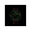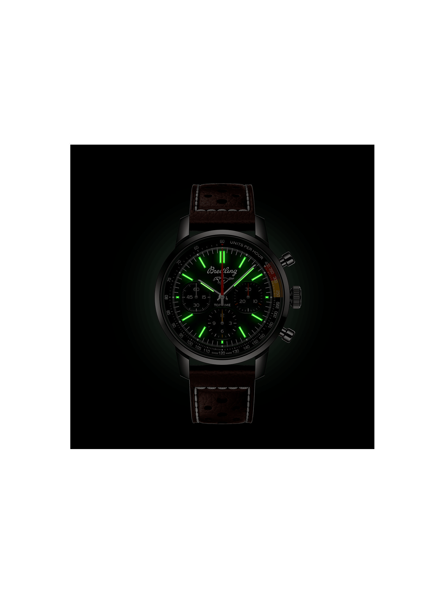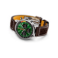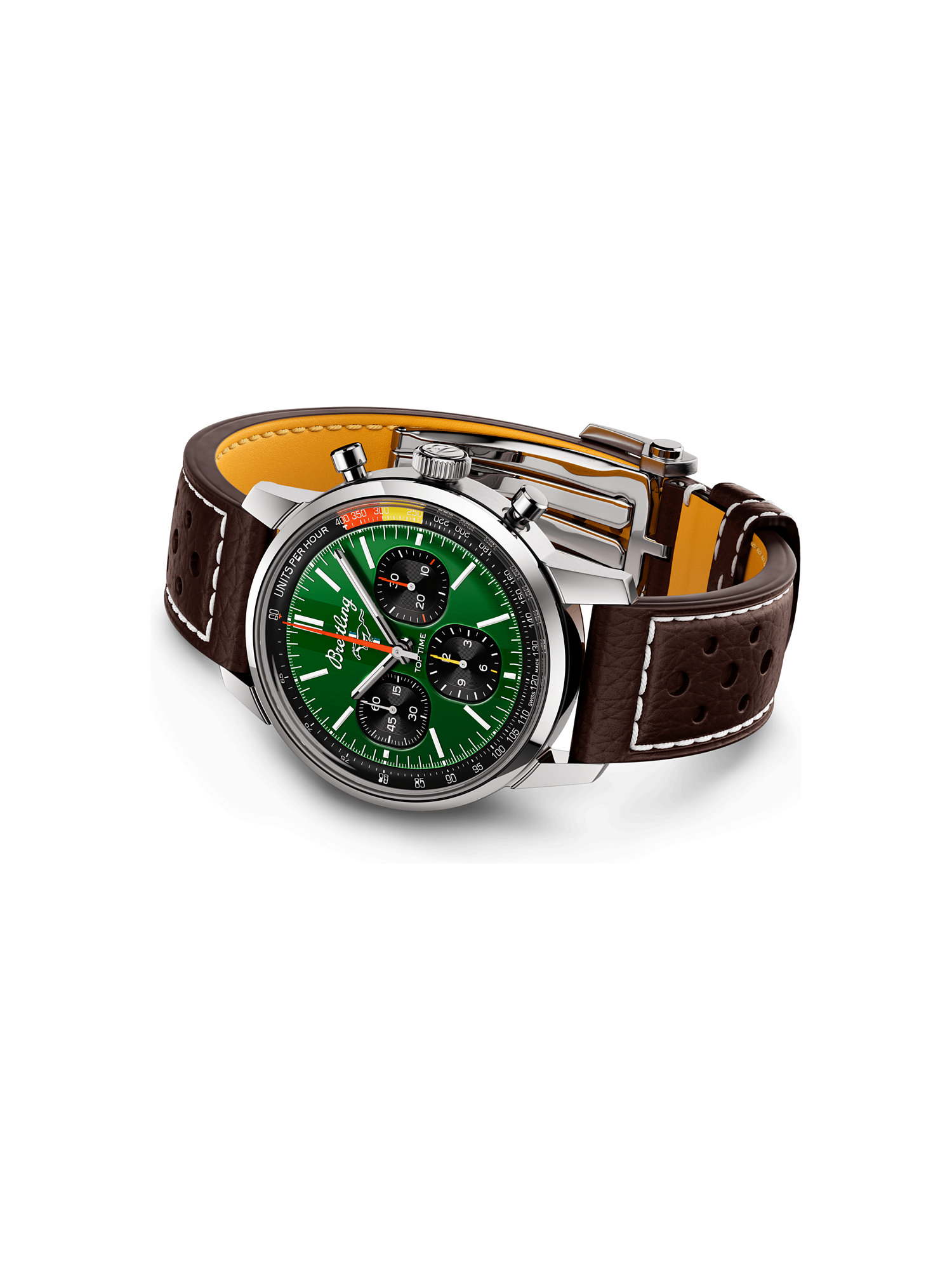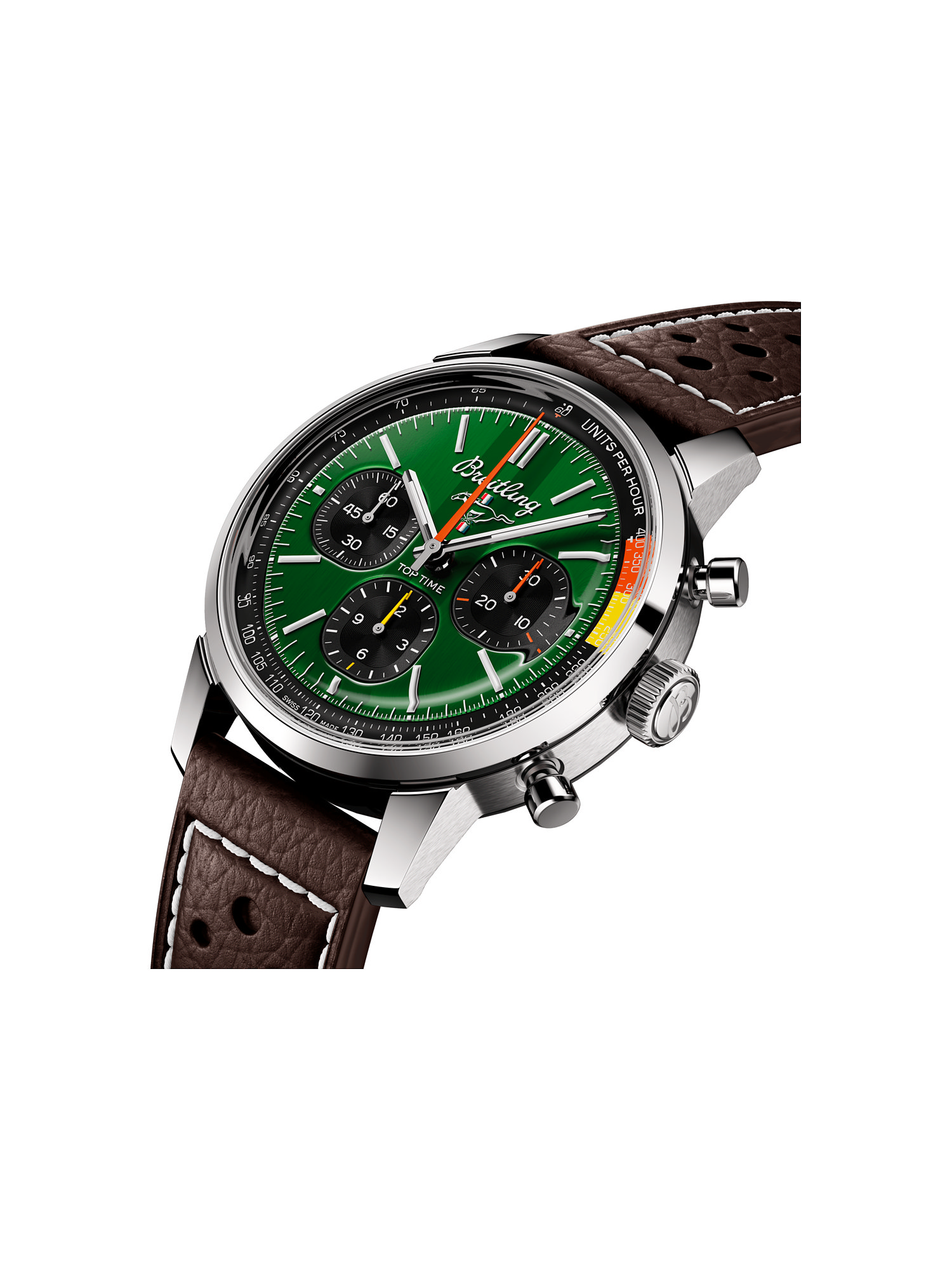 Breitling Uhren sind Meisterstücke der Uhrmacherkunst, die Design, Technologie und Präzision auf höchstem Niveau vereinen. Diese Luxusmarke aus Grenchen in der Schweiz verbindet Tradition und Innovation in ihren Uhren, wobei die enge Verbindung zur Luftfahrt stets spürbar bleibt. Die Breitling Top Time Cars ist ein Racing-Chronograph, der für Sie entworfen wurde, wenn Sie bei Stil und Qualität keine Kompromisse eingehen möchten. Das Edelstahlgehäuse mit Lederband verleiht der Uhr einen sportlichen Look, der sowohl im Büro als auch in der Freizeit perfekt zur Geltung kommt. Mit einem Durchmesser von 41 mm und einer Gehäusedicke von 14,27 mm passt diese Breitling trotz ihrer auffälligen Maße wunderbar zu vielen Handgelenken. Der kühle Schimmer des Edelstahlgehäuses sorgt für einen hochwertigen Look, während die silberne Lünette harmonisch dazu ergänzt. Auf dem grünen Ziffernblatt sorgen Leuchtindizes für eine gute Ablesbarkeit, auch bei schwierigen Lichtverhältnissen, und die Leuchtzeiger mit hochwertiger, lang nachleuchtender Leuchtmasse sind klar erkennbar. Der Chronograph zeigt die typischen Komplikationen wie kleine Sekunde und Totalisatoren. Das verwendete Saphirglas ist besonders widerstandsfähig gegen Kratzer und sorgt damit für Langlebigkeit. Mit einer Wasserdichte von 10 bar können Sie mit der Top Time Cars problemlos schwimmen. Das verbaute Automatikwerk zieht sich bei jeder Bewegung Ihres Handgelenks selbst auf. Ein schönes Feature für Sie als Liebhaber: Das Sichtfenster im Boden gewährt Ihnen Einblicke ins Werk, sodass Sie die Bewegungen des Rotors und der Unruh beobachten können. Das Lederband in klassischem Braun hält die Uhr dank der Sicherheits-Faltschließe sicher an ihrem Platz. Als gelungenes Gesamtpaket aus Design und Technik wird diese Breitling auch in vielen Jahren noch Ihr geschätzter Begleiter am Handgelenk sein.