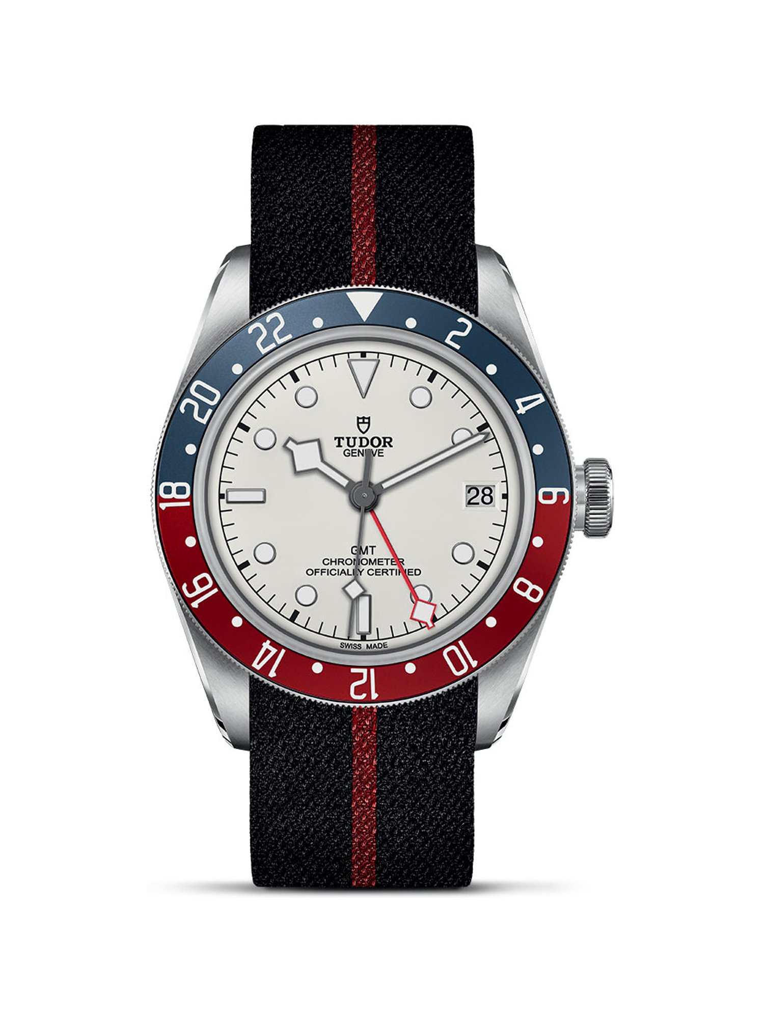 Die Schweizer Uhrenmarke TUDOR bietet Ihnen mechanische Armbanduhren von herausragender Qualität, die raffinierten Stil mit einem einzigartigen Preis-Leistungs-Verhältnis vereinen. Unter dem Leitgedanken #BornToDare kreiert TUDOR Uhren, die höchste Widerstandsfähigkeit und Zuverlässigkeit garantieren. So ist jede TUDOR Armbanduhr perfekt geeignet für Ihre außergewöhnlichsten Abenteuer an Land, Eis, in der Luft und unter Wasser, ohne dabei Abstriche an der Ästhetik zu machen. Nehmen Sie die Tudor Black Bay GMT, eine Taucheruhr für den anspruchsvollen Herren, die mit ihrem Edelstahlgehäuse und dem Textilband sportiven Style ausstrahlt. Der Gehäusedurchmesser von 41 mm passt je nach Vorliebe an eine Vielzahl von Handgelenken. Das polierte Finish verleiht dem Gehäuse einen modernen und ausdrucksstarken Look, während die drehbare Lünette in Zweifarbigkeit gestaltet ist. Auf dem weißen Ziffernblatt sorgen Leuchtindizes für hervorragende Ablesbarkeit, auch bei ungünstigen Lichtverhältnissen, und die lang nachleuchtenden Leuchtzeiger sind ebenfalls leicht erkennbar. Zusätzlich verfügt das Ziffernblatt über eine Datumsanzeige. Das verwendete Saphirglas ist extrem hart und somit sehr kratzfest. Mit einer Wasserdichte von 20 bar ist die Black Bay GMT bestens gerüstet für Ihre Abenteuer auf und unter Wasser. Krone und Gehäuseboden sind verschraubt, was die Uhr zu einem Modell macht, das höchsten Ansprüchen gerecht wird. Das Automatikwerk zieht sich bequem bei jeder Handgelenksbewegung auf, und mit einer Gangreserve von beeindruckenden 70 Stunden kann die Uhr mehrere Tage ungetragen bleiben, ohne neu gestellt werden zu müssen. Das Band aus Textil in klassischem Bicolor hält die Uhr sicher durch die Dornschließe am Platz. Als luxuriöser Begleiter bereitet diese Tudor Ihnen viele Jahre hinaus Freude.