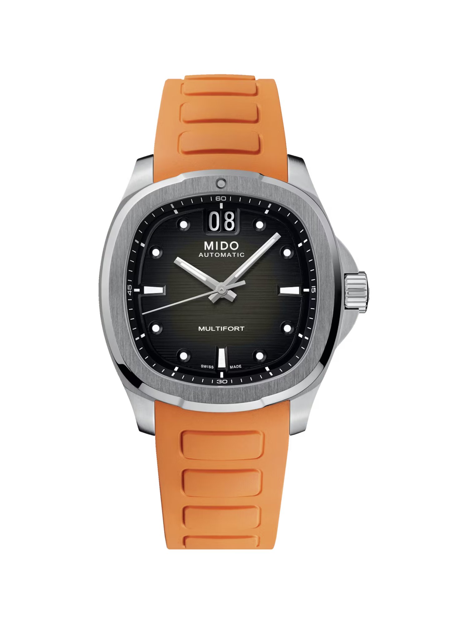 Innovation, Ästhetik und Funktionalität – diese Werte zeichnen die Zeitmesser von Mido aus. Das Design ist von klaren Linien geprägt und verkörpert zeitlose Eleganz. Wenn Sie auf der Suche nach einem wahren Allrounder für den Alltag, Business und besondere Anlässe sind, treffen Sie mit der Herrenuhr Multifort genau die richtige Wahl. Durch ihr kompromisslos geschmackvolles Design passt die hochklassige Uhr sich spielerisch allen Looks an. Das robuste, orange Armband aus Kautschuk sorgt für zeitlosen Chic und angenehmen Tragekomfort. Das anthrazite Zifferblatt fügt sich harmonisch in das Design der Uhr ein. Dank der Leuchtzeiger und Leuchtindizes ist das Ablesen der Uhrzeit auch bei schlechten Lichtverhältnissen mühelos möglich. Diese Uhr ist nicht nur elegant, sondern auch praktisch: Sie verrät Ihnen nicht nur die Uhrzeit, sondern auch das Datum. Ein gleichermaßen hochwertiges wie strapazierfähiges Saphirglas schützt das Zifferblatt vor Kratzern, Stößen und Schlägen. Für zuverlässige Präzision sorgt das Eta-Werk. Dank der Automatik-Funktion wird es durch die natürlichen Bewegungen Ihres Handgelenks aufgezogen. Doch selbst für den unwahrscheinlichen Fall, dass Sie diese Uhr einmal längere Zeit nicht tragen sollten, gibt es gute Nachrichten: Die hohe Gangreserve von 80 Stunden sorgt auch dann für leistungsfähiges Durchhaltevermögen. Durch das Sichtfenster im Gehäuseboden können Sie die faszinierende Arbeit des Uhrwerks beobachten. Sicheren Halt und gute Verstellbarkeit garantiert die Dornschließe.