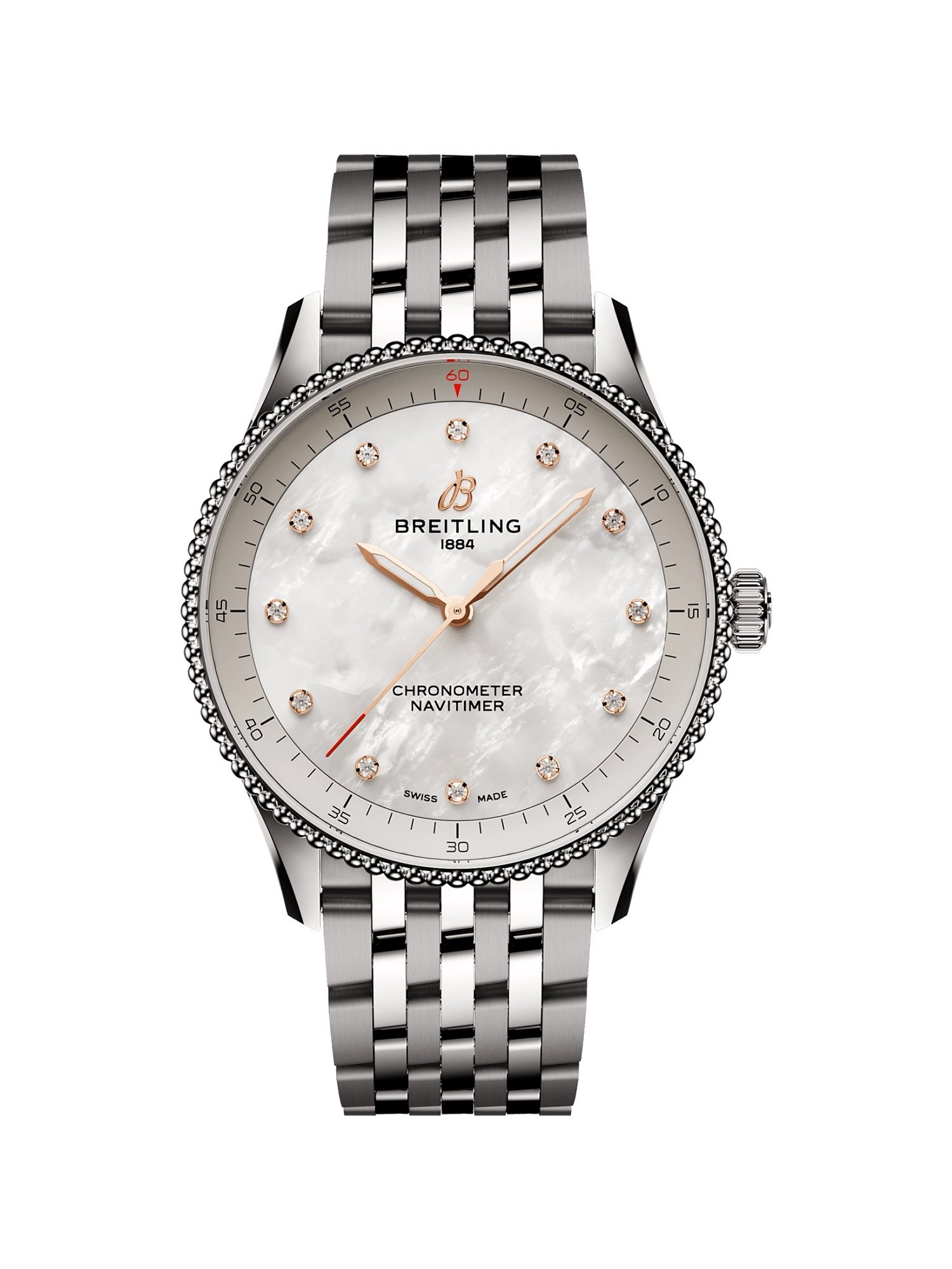 Gegründet im Jahr 1884, hat Breitling mit bahnbrechenden Innovationen mehrfach unter Beweis gestellt, dass die Luxusmarke nicht nur für zeitlos schöne Designs mit starken Anklängen an die Luftfahrt steht, sondern auch Technologieführer der Branche ist. Die Breitling Navitimer 32, eine Fliegeruhr für die anspruchsvolle Dame, bietet Ihnen mit ihrem Edelstahlgehäuse und Edelstahlband einen sportiven Stil. Mit einem Gehäusedurchmesser von 32 mm und einer Gehäusedicke von 8 mm gehört diese Breitling zu den eher dezenten Uhren und wirkt weniger wuchtig als vergleichbare Fliegeruhren. Das Gehäuse aus massivem Edelstahl ist robust und verleiht der Uhr ihren klassisch-sportlichen Look, während die Lünette in Silber harmonisch ergänzt. Die Markierungen auf dem Ziffernblatt in Perlmutt sorgen für eine ausgezeichnete Ablesbarkeit, und die Zeiger heben sich klar davon ab – so haben Sie die Zeit stets auf einen Blick erfasst. Ein strahlendes Highlight setzen die 12 Diamanten. Das extrem harte und kratzfeste Saphirglas sorgt für eine ungehinderte Sicht. Die Uhr ist wasserdicht bis 5 bar und eignet sich somit auch zum Baden. Durch das hochwertige, wartungsarme Quarzwerk in dieser Uhr ist höchste Präzision garantiert, und die Ganggenauigkeit wurde durch die Chronometer-Zertifizierung der COSC bestätigt. Das Stahlband wird durch eine Butterfly-Faltschließe sicher an Ihrem Arm gehalten. Als luxuriöser Begleiter wird Ihnen diese Breitling auf viele Jahre hinaus Freude bereiten.
