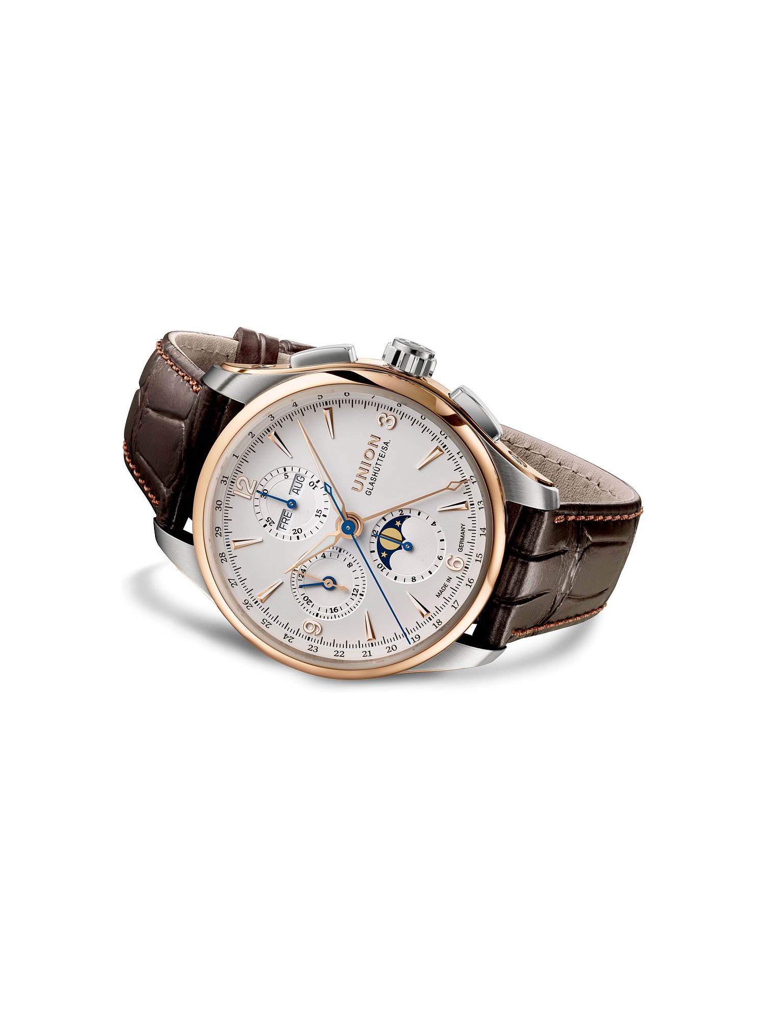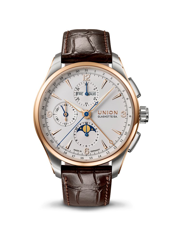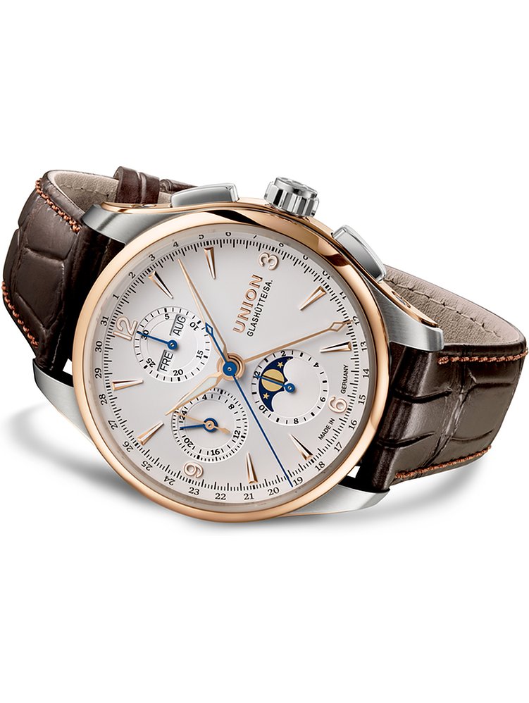 Ein ausdrucksstarker und moderner Look entsteht durch das polierte Finish, während die Lünette in Roségold sich elegant einfügt. Auf dem Ziffernblatt in Weiß sorgen Leuchtindizes für eine leichte Ablesbarkeit, auch bei ungünstigen Lichtverhältnissen. Die Leuchtzeiger mit hochwertiger, lang nachleuchtender Leuchtmasse sind darauf deutlich zu erkennen. Typisch für einen Chronographen zeigt auch diese Union Glashütte die Komplikationen Stoppfunktion, Totalisatoren und kleine Sekunde. Wochentag und Datum werden ebenfalls angezeigt. Stets guten Durchblick garantiert das kratzfeste, extrem harte Saphirglas.