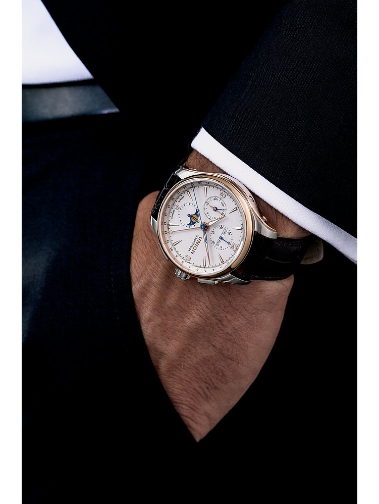 Die Union Glashütte Belisar Chronograph Mondphase ist der klassische Chronograph für Sie, wenn Sie bei Stil und Qualität keine Kompromisse eingehen möchten. Das Gehäuse aus Edelstahl mit Roségold bietet zusammen mit dem Kalblederband einen sportlichen Look, der vom Office bis in die Freizeit perfekt passt. Diese Union Glashütte hat ein Gehäuse mit einem Durchmesser von 42 mm und einer Gehäusedicke von 14,8 mm – trotz dieser eher auffälligen Maße fügt sie sich dennoch harmonisch an viele Handgelenke an.