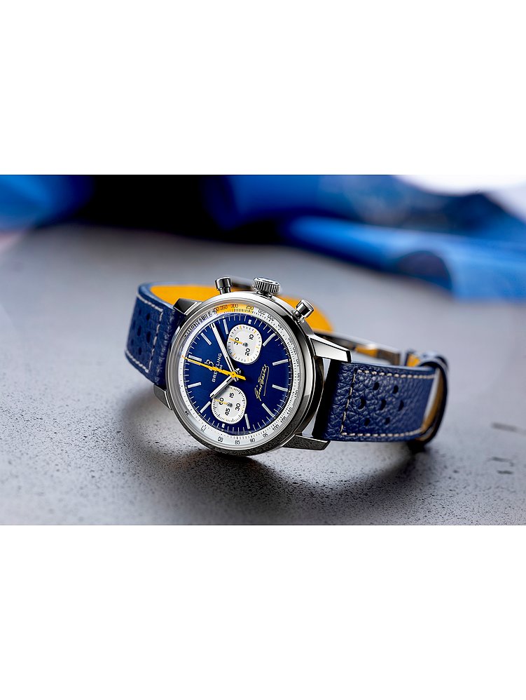Mit einer Wasserdichte von 10 bar ist Schwimmen mit der Top Time ohne weiteres möglich. Das Herzstück der Uhr ist das exzellente Automatikwerk, das sich durch Bewegung selbst aufzieht. Das Werk ist als Chronometer durch die COSC zertifiziert. Ein tolles Highlight für Kenner: Das Sichtfenster im Gehäuse ermöglicht faszinierende Einblicke in das Uhrwerk. Die Bewegungen von Rotor und Unruh sind so jederzeit sichtbar. Ein farblicher Hingucker ist das Band aus Leder in Blau mit Faltschließe, durch das die Uhr sicher und bequem am Arm gehalten wird. Alles in allem eine Breitling, die nichts zu wünschen übrig lässt und Ihnen auf lange Jahre hinaus zum geliebten Begleiter werden wird.