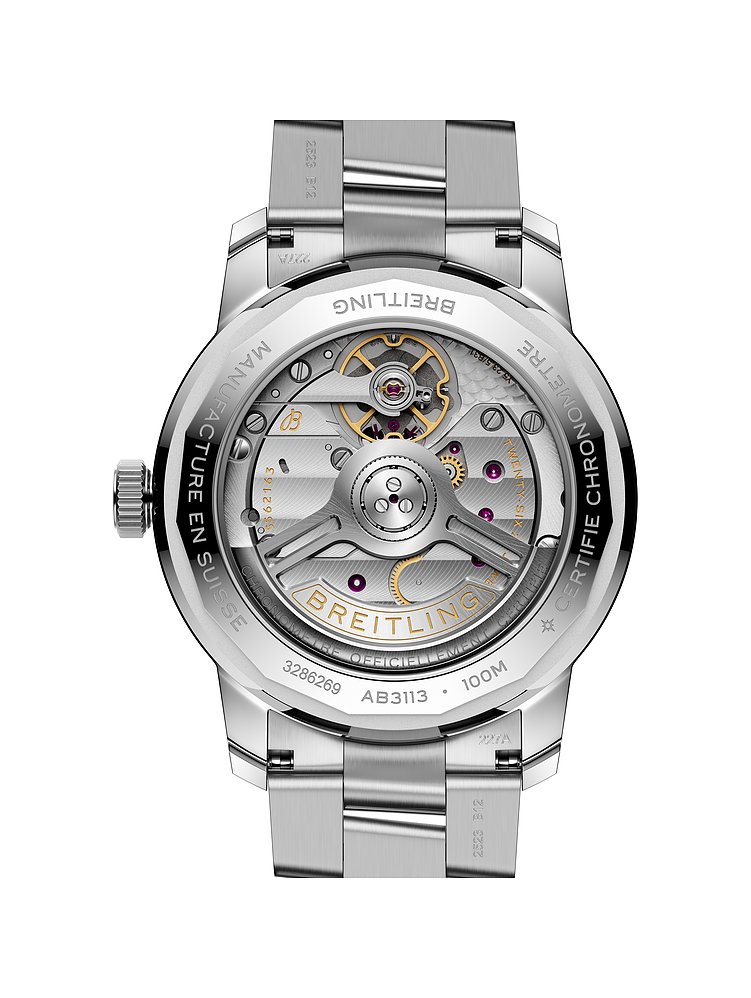 Die Uhr verfügt über ein exzellentes Automatikwerk, das sich durch Bewegung selbst aufzieht. Eine COSC-Zertifizierung als Chronometer belegt die exzellente Ganggenauigkeit. Der Boden ist aus robustem Saphirglas gefertigt und lässt so Einblicke in die Arbeit von Rotor und Unruh zu. Jeder Uhrenliebhaber wird von den Bewegungen des Rotors und der Unruh, die man durch das Sichtfenster im Boden beobachten kann, begeistert sein. Die Faltschließe des Stahlbands sorgt für einen stabilen Halt. Als ein gelungenes Gesamtpaket aus Design und Technik wird dieser Breitling auch in etlichen Jahren noch ihren Platz als geliebter Begleiter an Ihrem Handgelenk haben.
